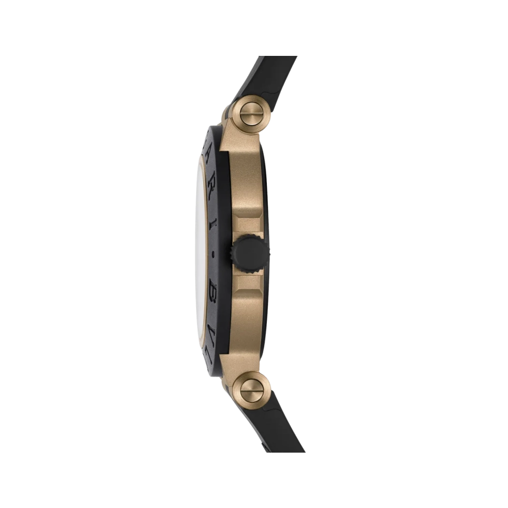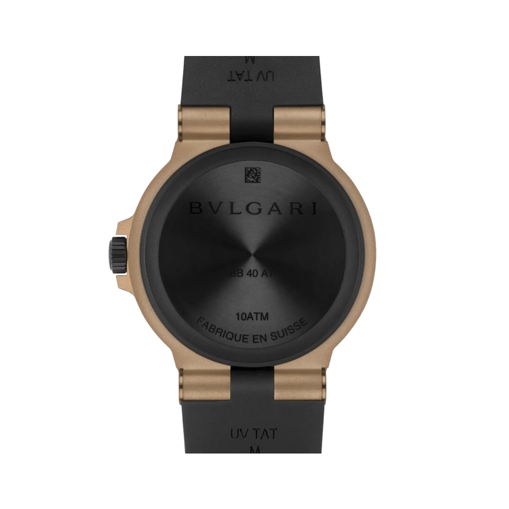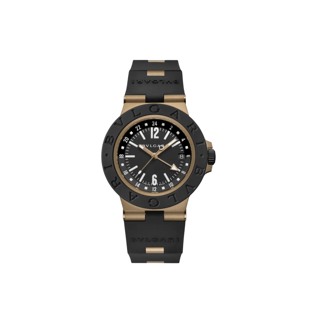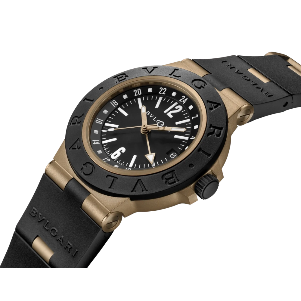 Otomatik kurmalı mekanik mekanizmaya sahip, GMT 24 saat fonksiyonlu Bvlgari Bronzo GMT saat. 40 mm kumlanmış bronz kasa, siyah kauçuk bezel ve kayış, mat vernikli siyah kadran. 100 metreye kadar suya dayanıklıdır.