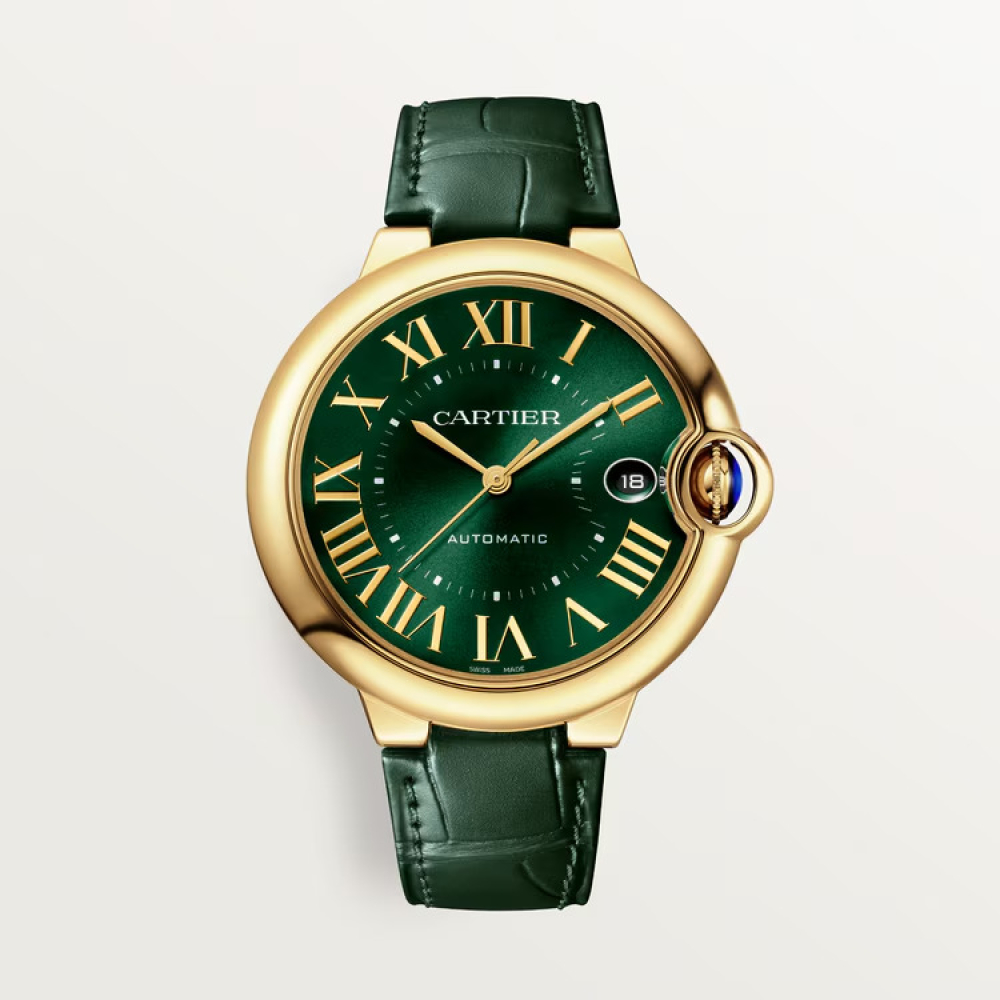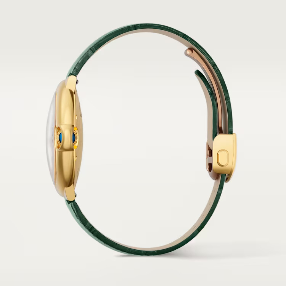 Ballon Bleu de Cartier saat, 40 mm, otomatik kurmalı mekanik mekanizma, kalibre 1847 MC. Sarı altın 750/1000 kasa, bir kabaşon safirle süslenmiş yivli kurma kolu, yeşil güneş ışını efektli kadran, altın finisajlı çelikten kılıç şeklinde ibreler. Safir kristal. Değiştirilebilir yeşil timsah derisi kayış, sarı altın 750/1000 değiştirilebilir katlanır toka, saat 3 konumunda tarih penceresi. Kalınlık: 12,4 mm. 3 bar'a (yaklaşık 30 metre) kadar su geçirmezlik.