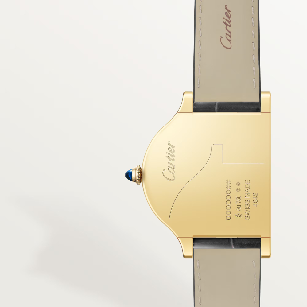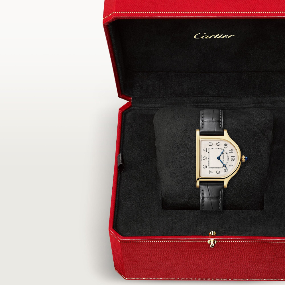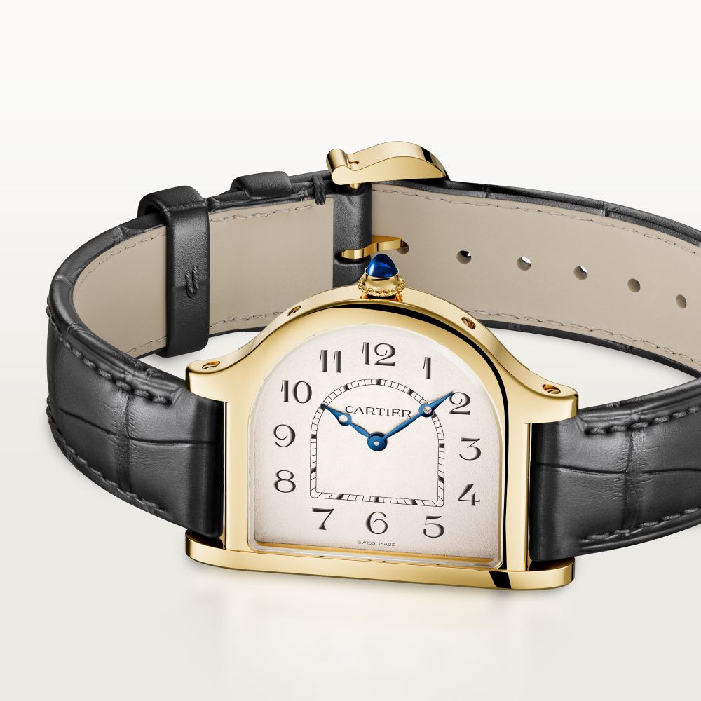 Cloche de Cartier saat, manuel kurmalı mekanik mekanizma, 070 kalibre. Sarı altın 750/1000 kasa, bir safir kabaşonla set edilmiş sarı altın 750/1000 taşlı kurma kolu, altın rengi dokulu kadran, koyu gri Arap rakamı saat imleri, mavileştirilmiş çelikten elma şeklinde ibreler. Koyu gri timsah derisi kayış, sarı altın 750/1000 ardillon toka. Kasa boyutları: 37 x 28,65 mm. Kalınlık: 5,7 mm. Saat, dakika. 21 taşlı mekanizma. Mekanizma çapı: 15,29 mm. Mekanizma kalınlığı: 2,15 mm. Denge çarkı: 25.200 titreşim/saat, yaklaşık 38 saat güç rezervi. Suya dayanıklı değildir.