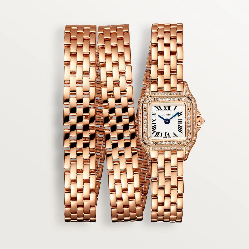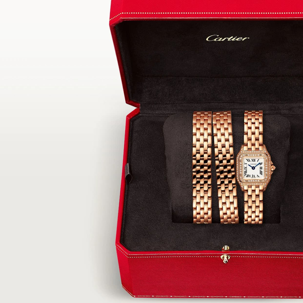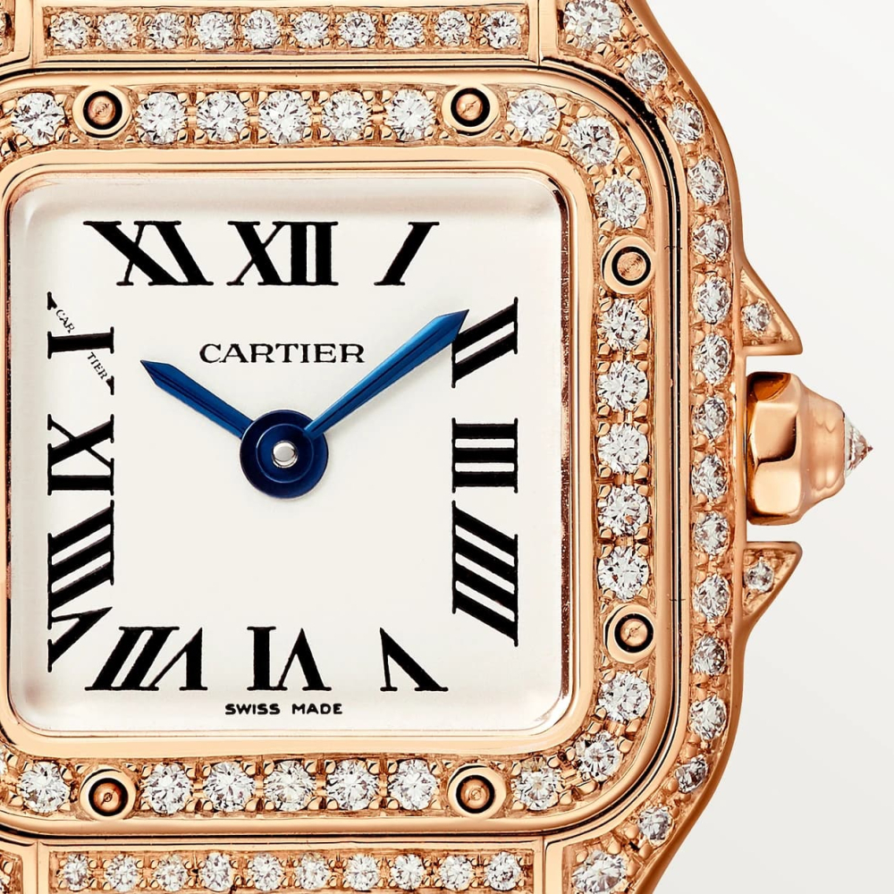 Panthère de Cartier saat, mini model, kuvars mekanizma. Parlak kesim pırlantalı 750/1000 pembe altın kasa, boyutlar: 20 mm x 25 mm, kalınlık: 6 mm, pırlantalı taç seti, gümüş kadran, maviye çalan çelik kılıç şeklinde ibreler, üçlü pembe altın 750/1000 halka bilezik, 3 bar'a (yaklaşık 30 metre) kadar suya dayanıklıdır.