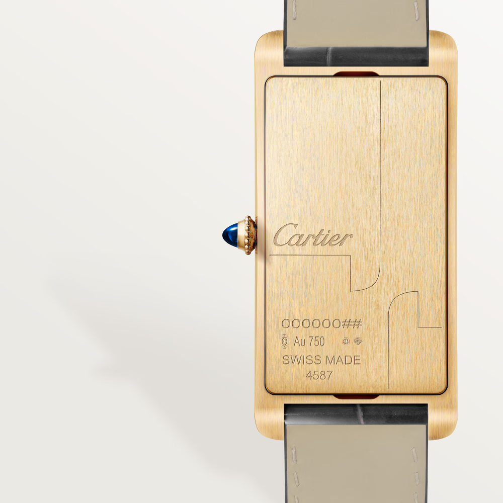 Tank Cintrée saat, elle kurmalı mekanik mekanizma, 1917 MC kalibre. Sarı altın 750/1000 kasa, bir safir kabaşonla set edilmiş sarı altın 750/1000 taşlı kurma kolu, altın rengi finisajlı opalin kadran, gri Roma rakamı saat imleri, mavileştirilmiş çelikten elma şeklinde ibreler. Koyu gri timsah derisi kayış, sarı altın 750/1000 ardillon toka. Kasa boyutları: 23 x 46,3 mm. Kalınlık: 6,95 mm. Saat, dakika. 19 taşlı mekanizma. Mekanizma çapı: 15,95 x 16 mm, mekanizma kalınlığı: 2,9 mm. Denge çarkı: 21.600 titreşim/saat, yaklaşık 38 saat güç rezervi. 3 bar'a (yaklaşık 30 metre) kadar suya dayanıklı.