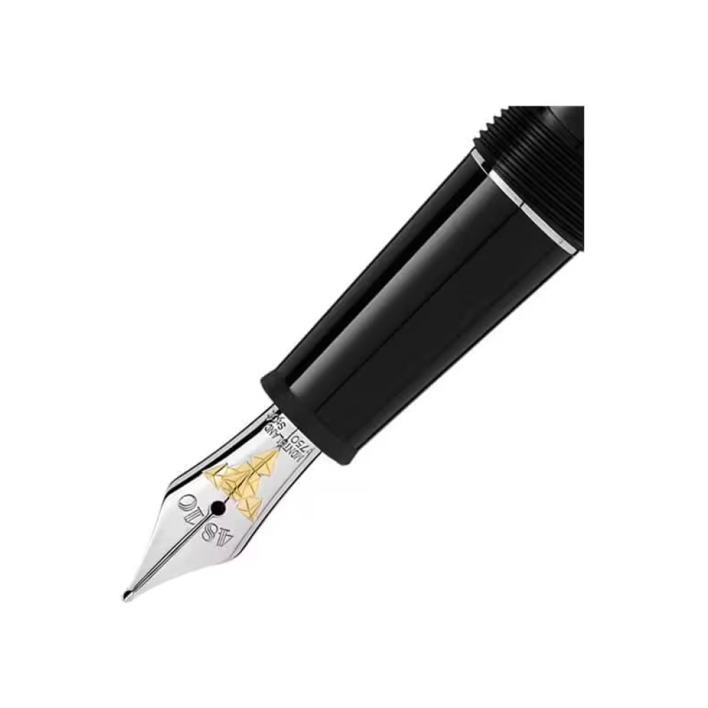 The Meisterstück Solitaire Geometric Dimension was born of the desire to unite Montblanc’s classic design with unique materials. This writing instrument made of black precious resin, engraved with a three-dimensional geometric pattern cap with optical effect in a sophisticated platinum tone, features an Au750 bi-color coated nib with special design, a platinum-coated clip and three platinum-coated rings embossed with the Montblanc brand name. Finished with the Montblanc emblem, it appeals to one’s individuality.