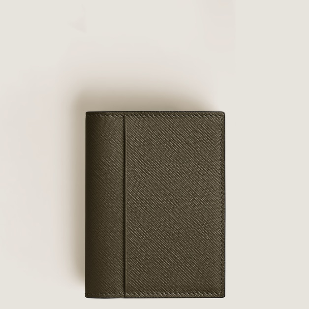Compact yet versatile, this card holder is crafted from sartorial leather in a sophisticated shade of khaki. Designed with functional details inside and out, it features three credit card slots, a business card compartment, and an additional pocket on the interior, while the exterior includes an extra slot for a fourth credit card.