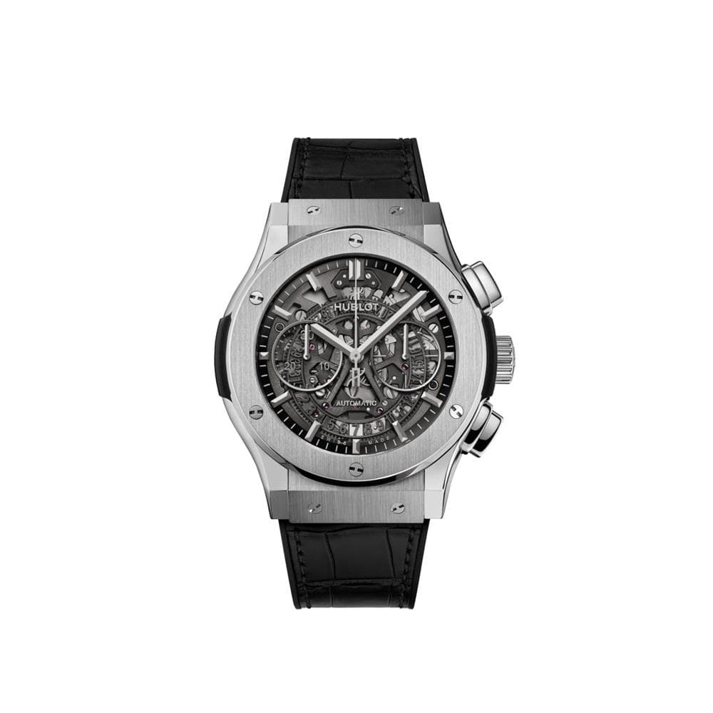 525.NX.0170.RX referans numaralı saat, Hublot markasının Classic Fusion koleksiyonuna aittir. Mekanizma yapısı mekanik otomatik olan Hublot Classic Fusion Aerofusion Titanium, titanyum bir kasaya sahip olup kasa çapı 45mm’dir. 50 metreye kadar su basıncına kadar dayanıklı olan model, deri kayış ile sunulmaktadır.