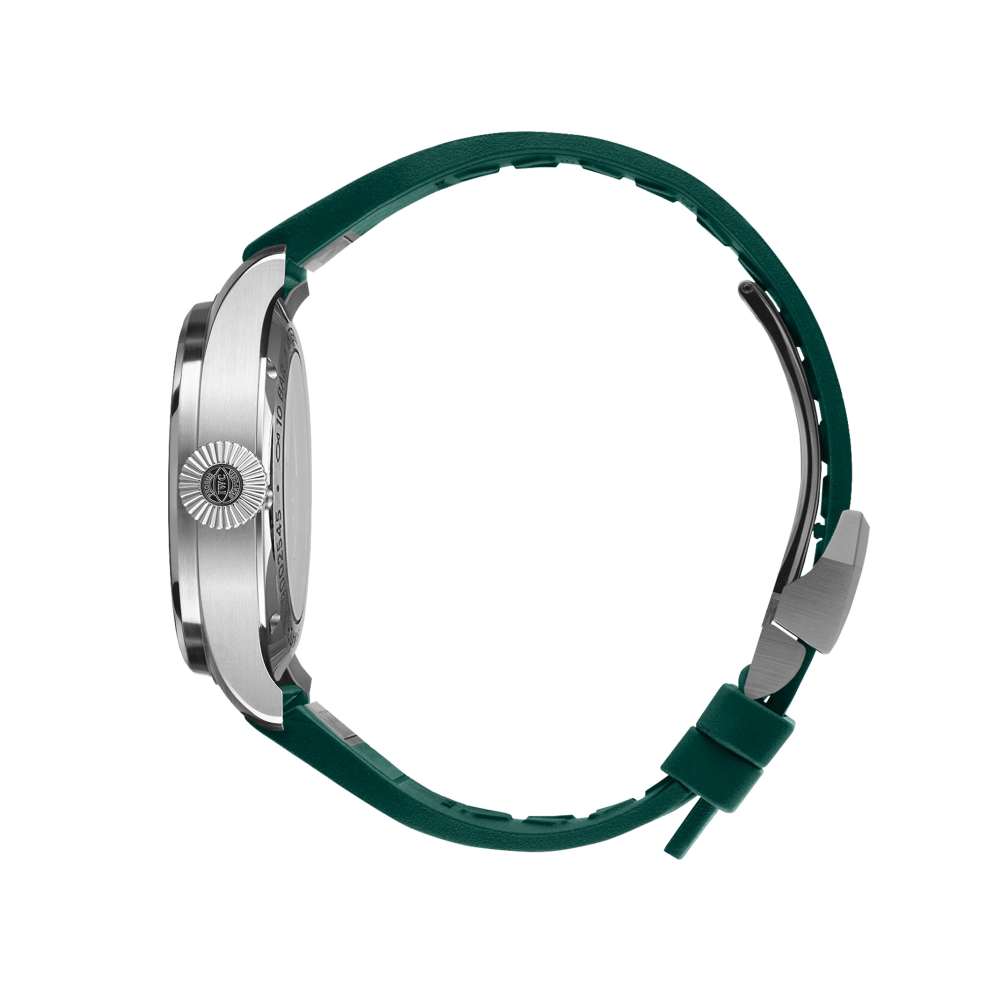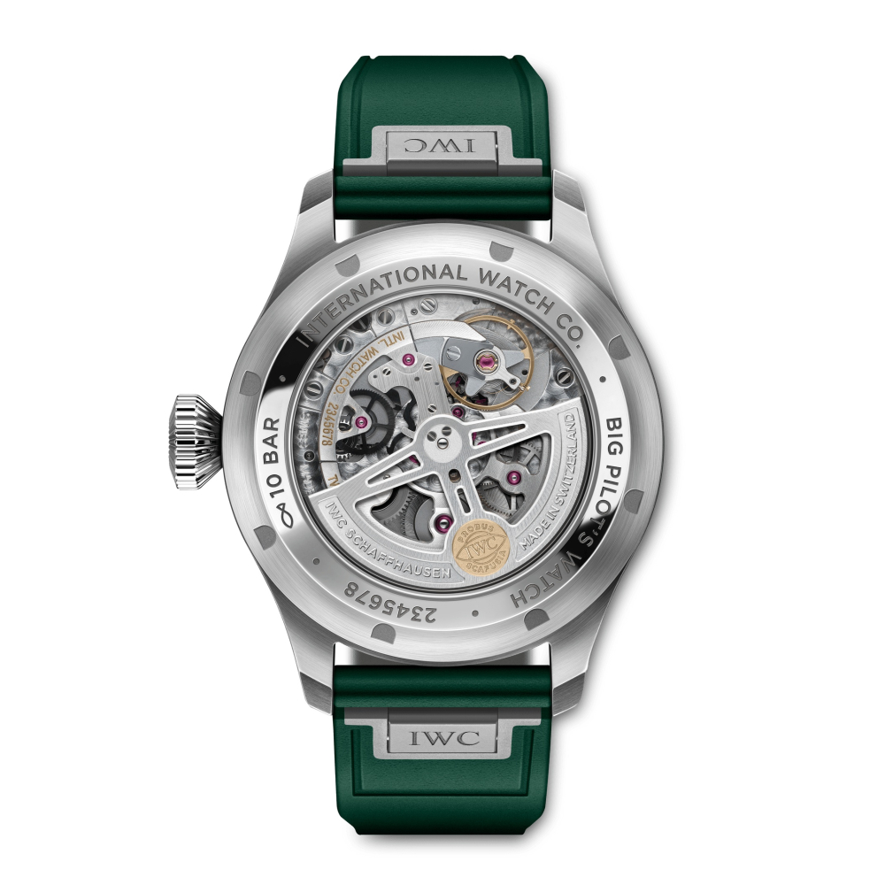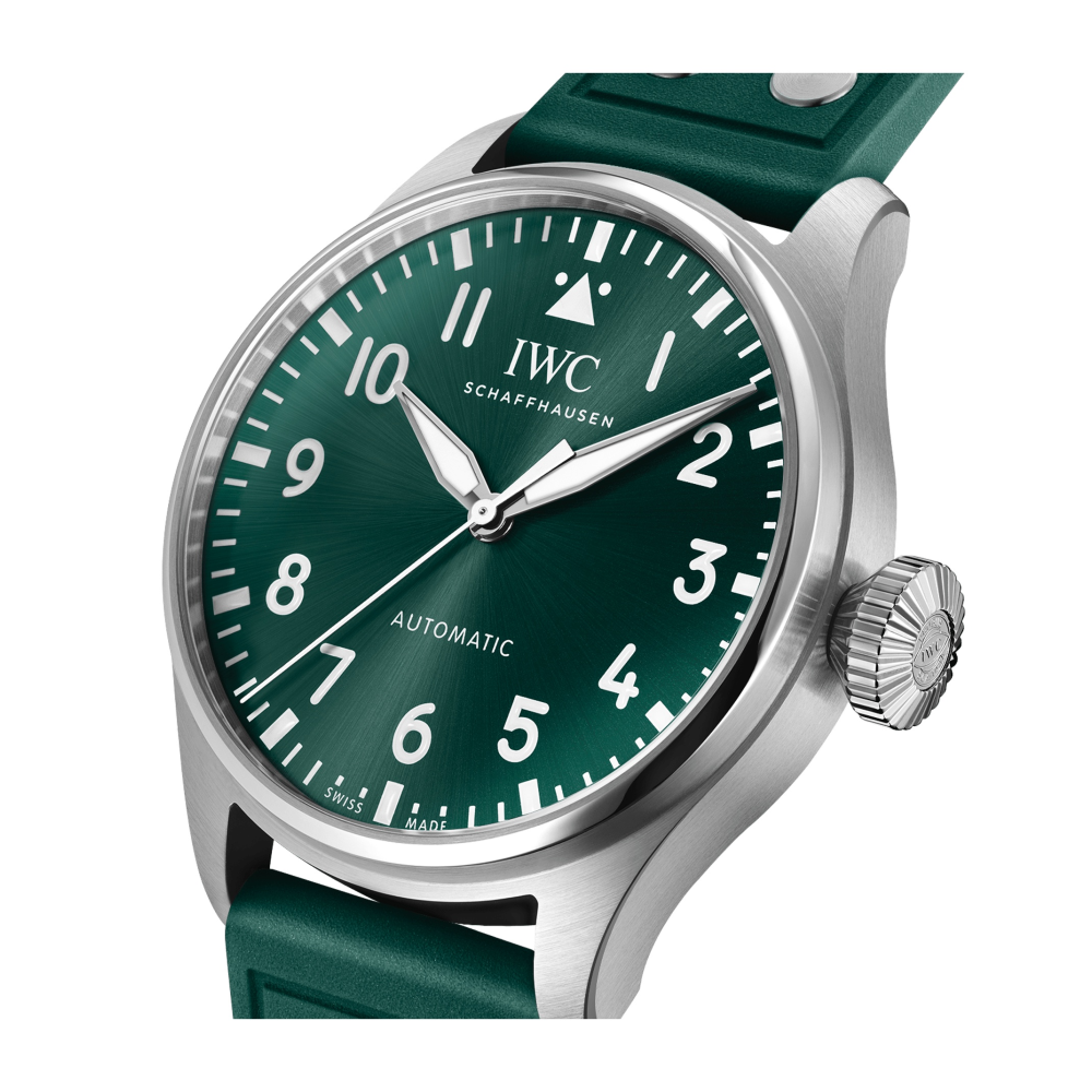 Bu Big Pilot’s Watch 43, paslanmaz çelik kasaya, “yarış yeşili” kadrana, rodyum kaplamalı kollara ve yeşil kauçuk kayışa sahiptir.