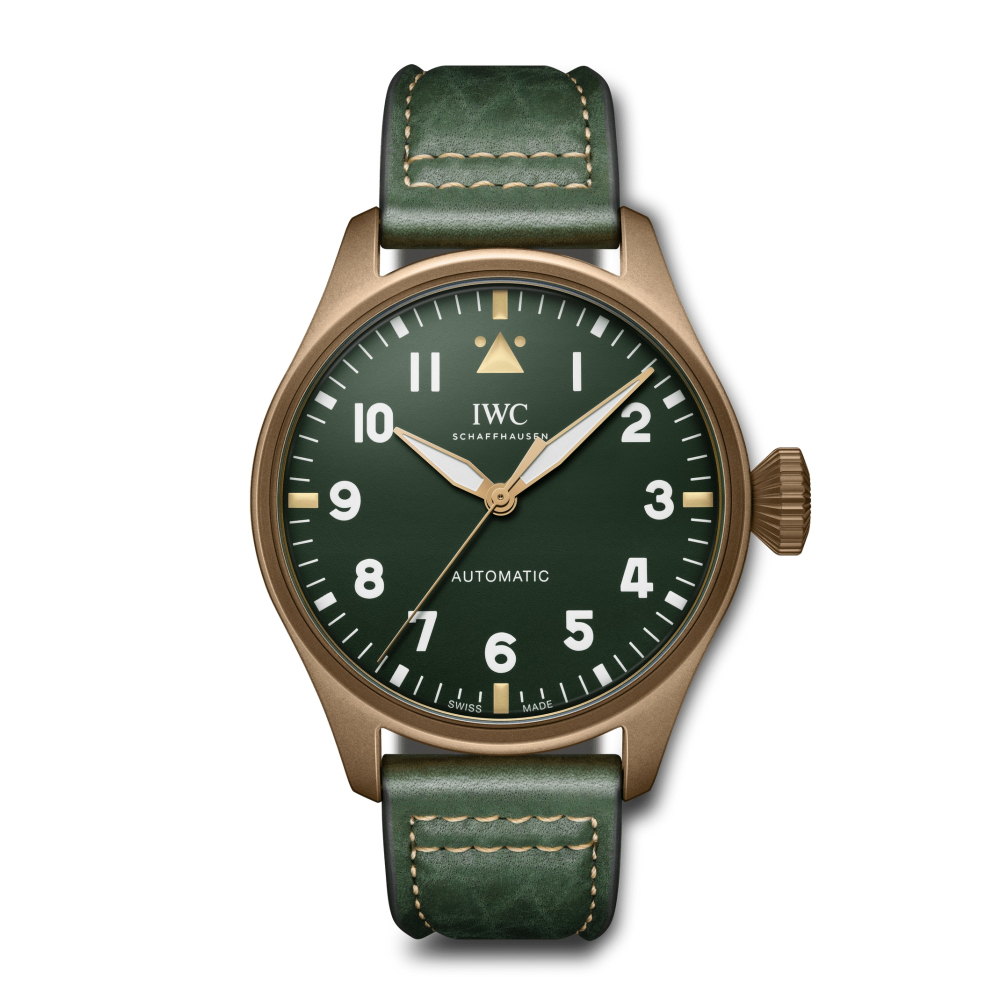 Big Pilot’s Watch 43 Spitfire, bronz kasa ve kurma kolu, askeri yeşil kadranı ve altın kaplama kollarıyla askeri bir estetiğe sahip.