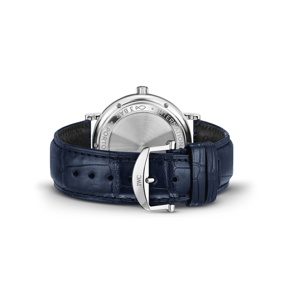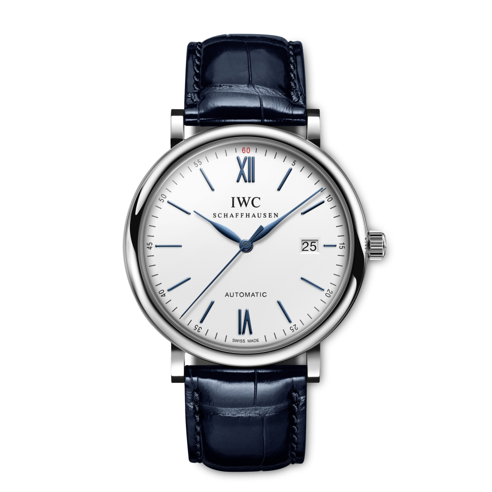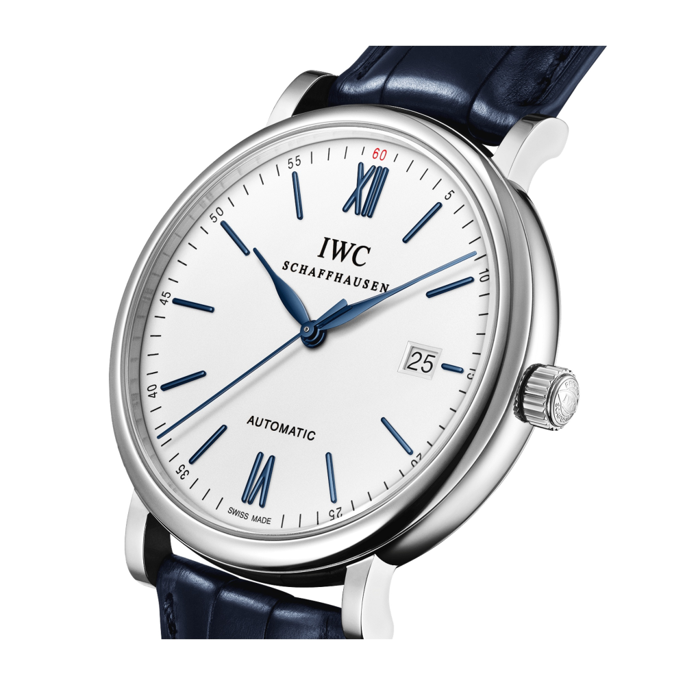 Mavi kollar ve aplikeler, gümüş kaplama kadran ve mavi timsah derisi kayış, paslanmaz çelikten üretilen bu Portofino Otomatik saate sıra dışı bir çekicilik katıyor.