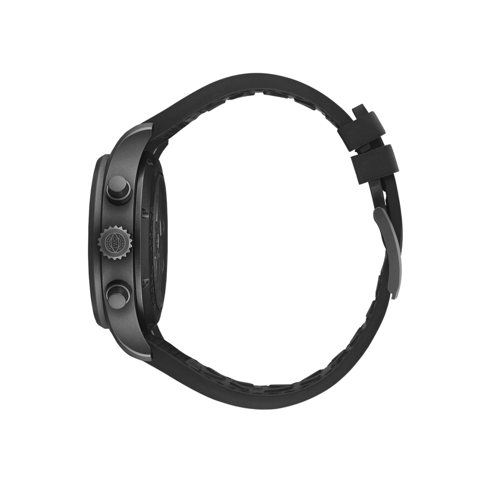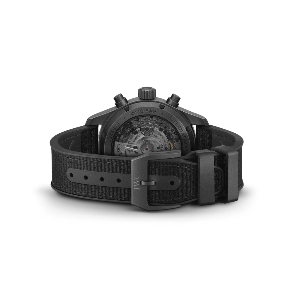 IWC'nin geliştirdiği Ceratanium® malzemesinden üretilen kasa, kurma kolu ve butonlar, Pilot's Watch Chronograph 41 TOP GUN Ceratanium®'a tamamen siyah bir tasarım kazandırıyor.