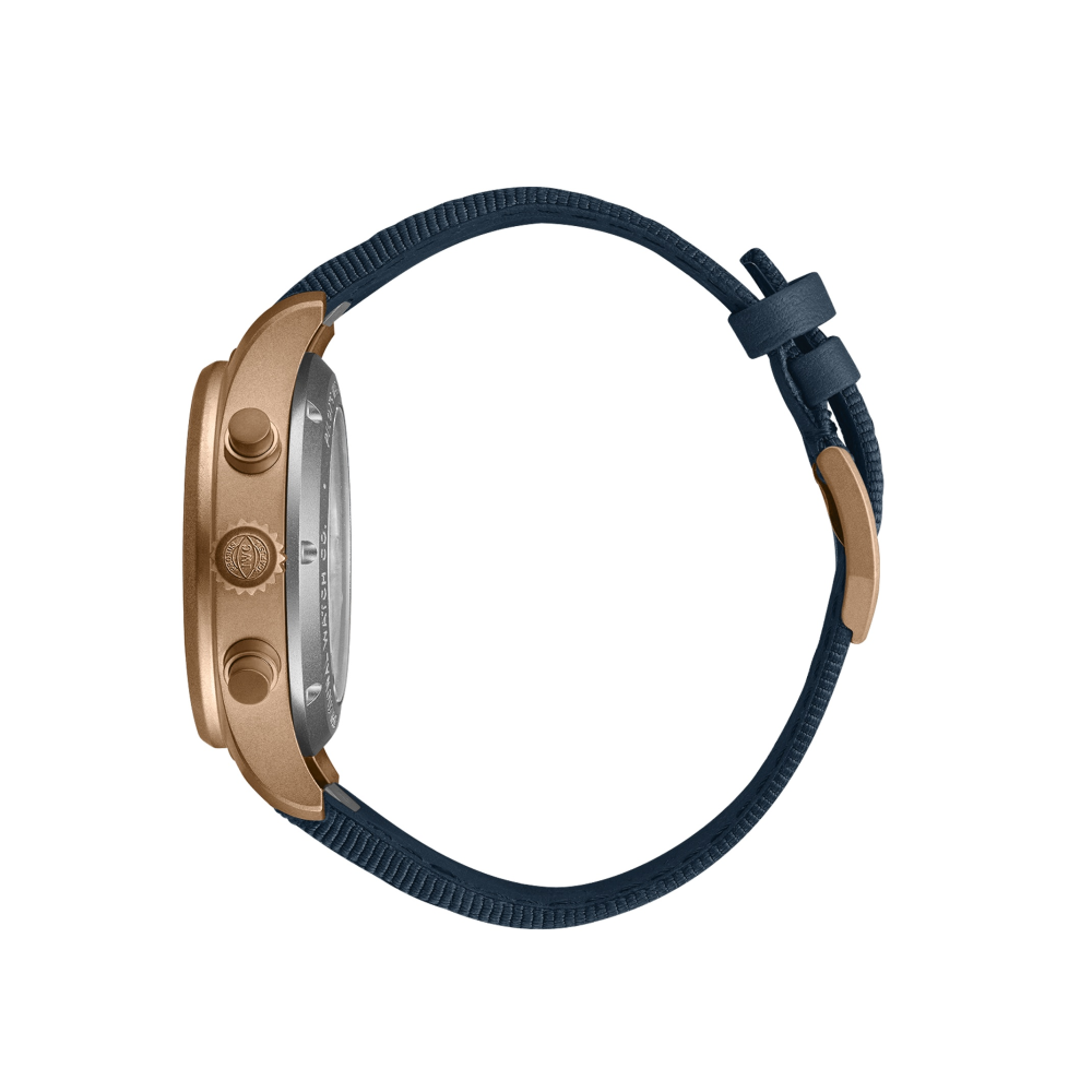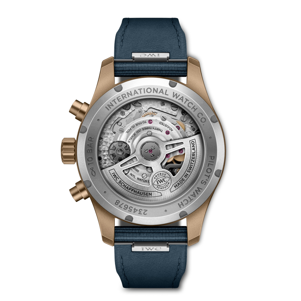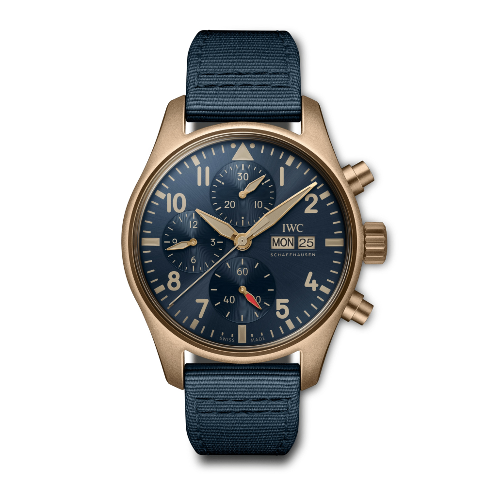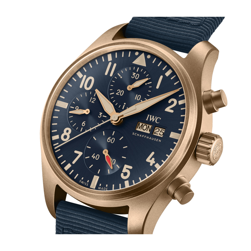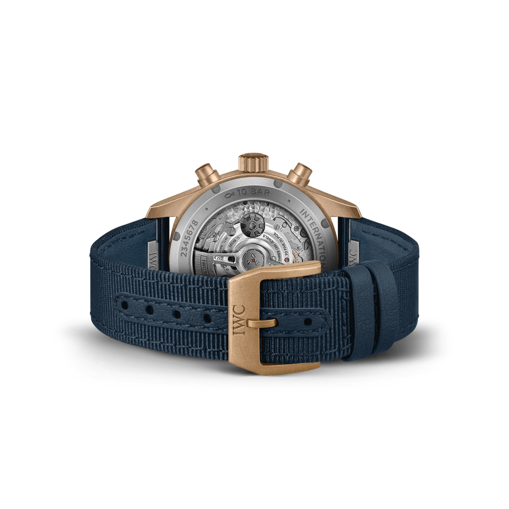 Pilot’s Watch Chronograph 41, zamanla patina oluşturan benzersiz bir malzeme olan bronzdan yapılmış bir kasaya, kurma koluna ve butonlara sahiptir.