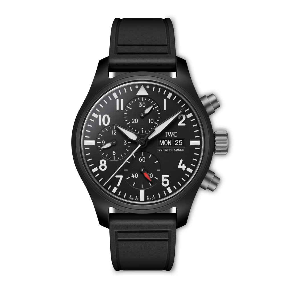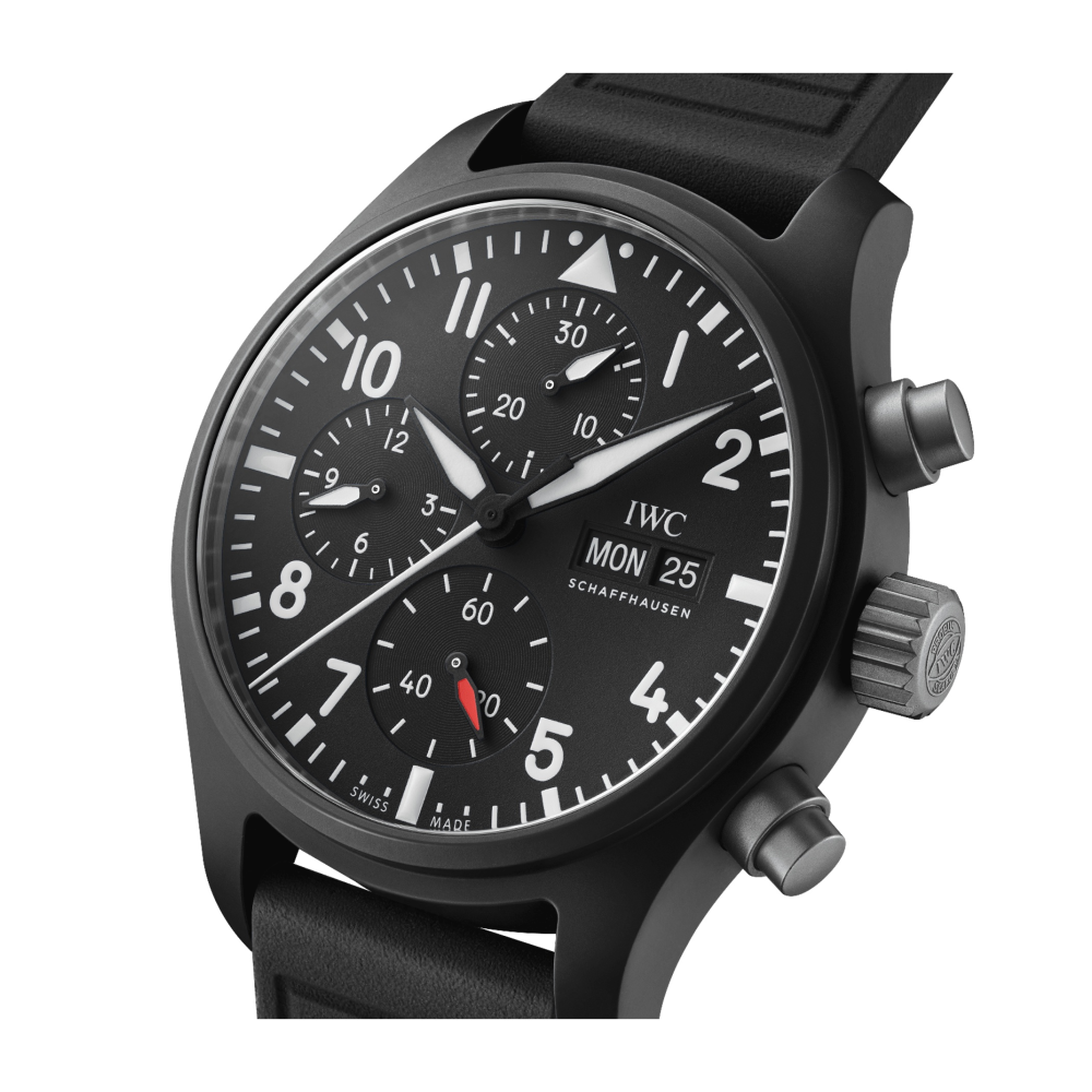 Pilot’s Watch Chronograph 41 TOP GUN, TOP GUN koleksiyonundaki siyah seramik kronograf geleneğini ergonomik 41 milimetrelik boyutuyla sürdürüyor.