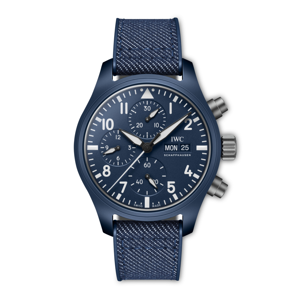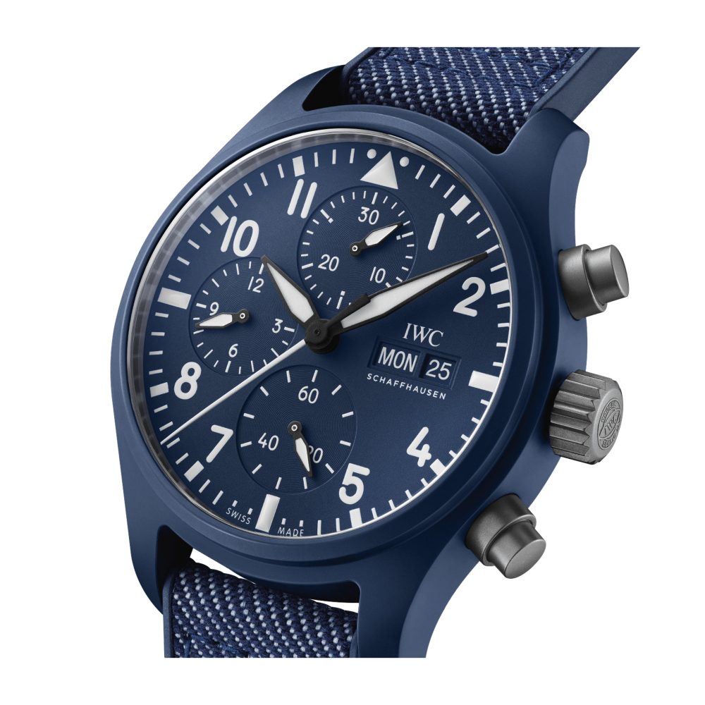 Pilot's Watch Chronograph 41 TOP GUN Oceana, 41 milimetre çapındaki kolay takılabilen mavi seramik kasası ve tek renkli tasarımıyla göz dolduruyor.