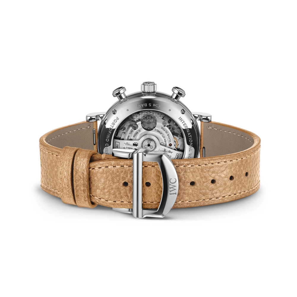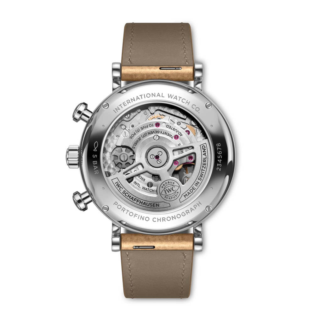 Portofino Chronograph 39, IWC üretimi 69355 kalibre ve safir cam arka yüze sahip.