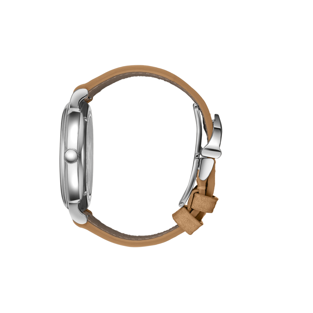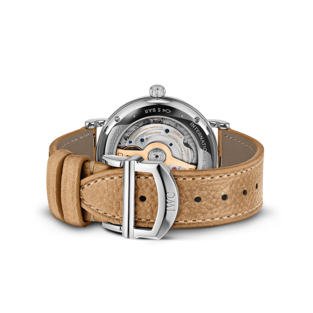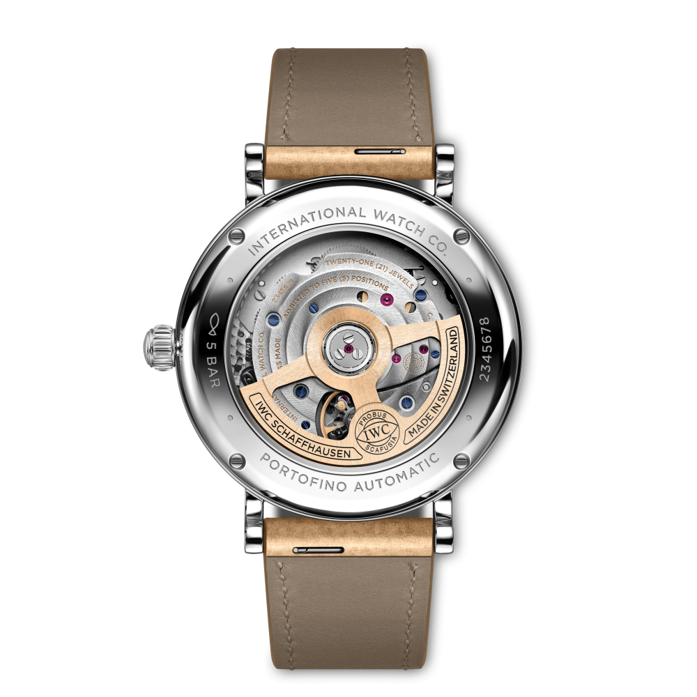 Portofino Automatic 37, IWC üretimi 32111 kalibre ve hareketi gösteren şeffaf safir cam arka yüze sahip.