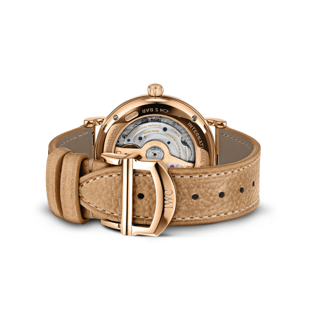 Portofino Automatic 37, IWC üretimi 32111 kalibre ve hareketi gösteren şeffaf safir cam arka yüze sahip.