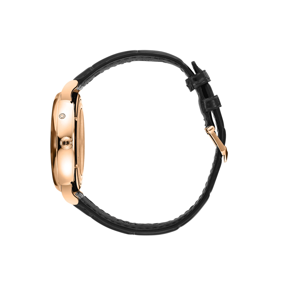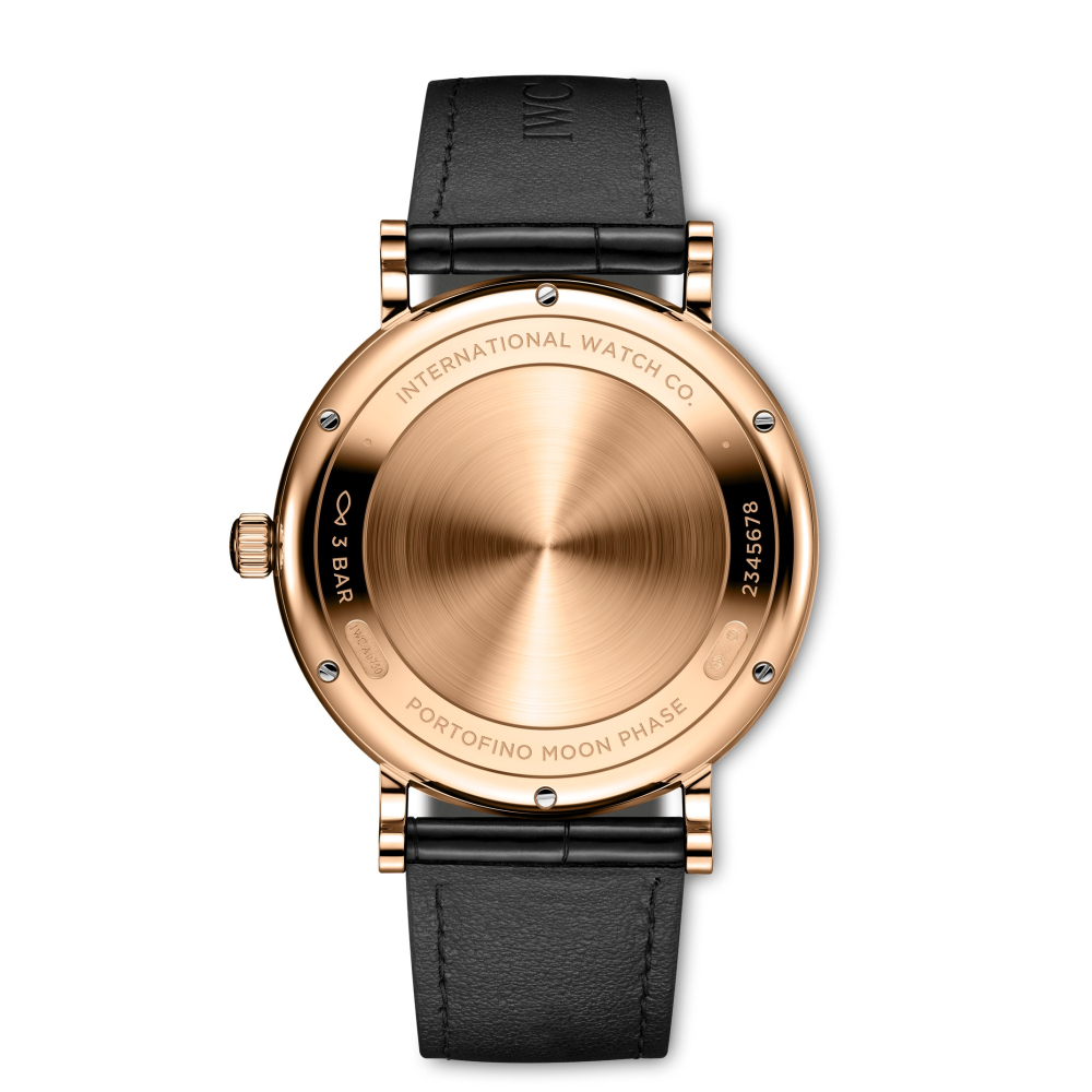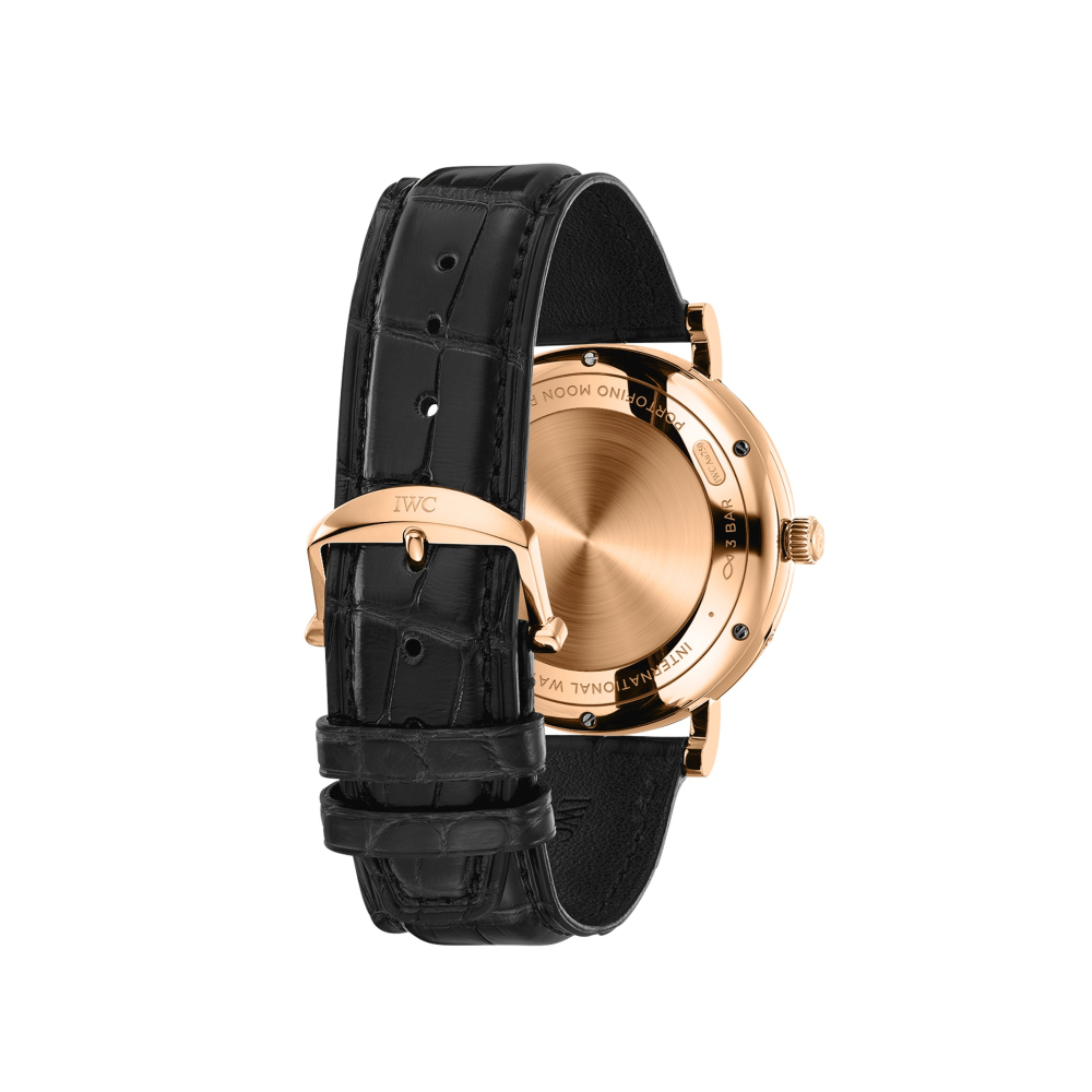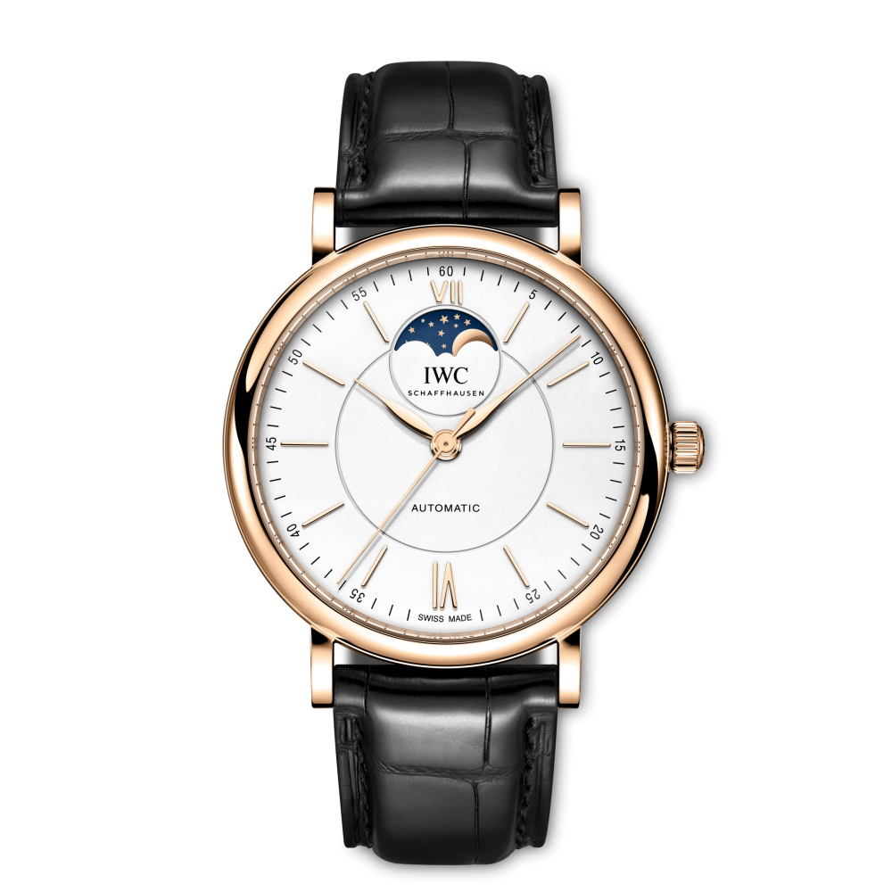 Portofino Automatic Moon Phase, 18 ayar 5N altın kasa, altın kaplama kollar ve gümüş kaplama kadran ile siyah timsah derisi kayışa sahip.