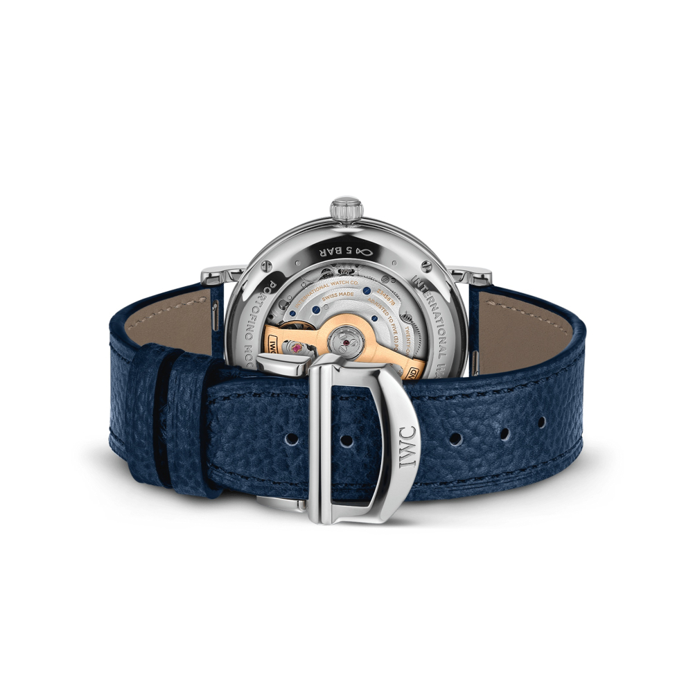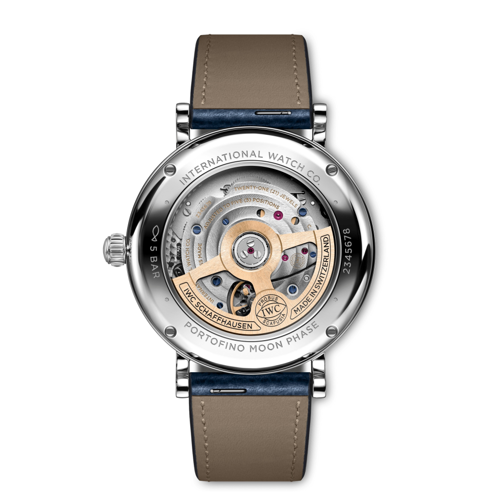 Portofino Automatic Moon Phase 37, IWC üretimi 32800 kalibre ve hareketi gösteren şeffaf safir cam arka yüze sahip.