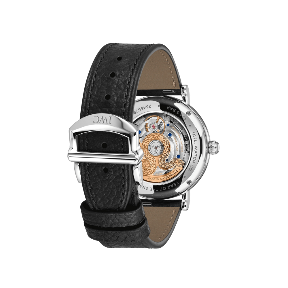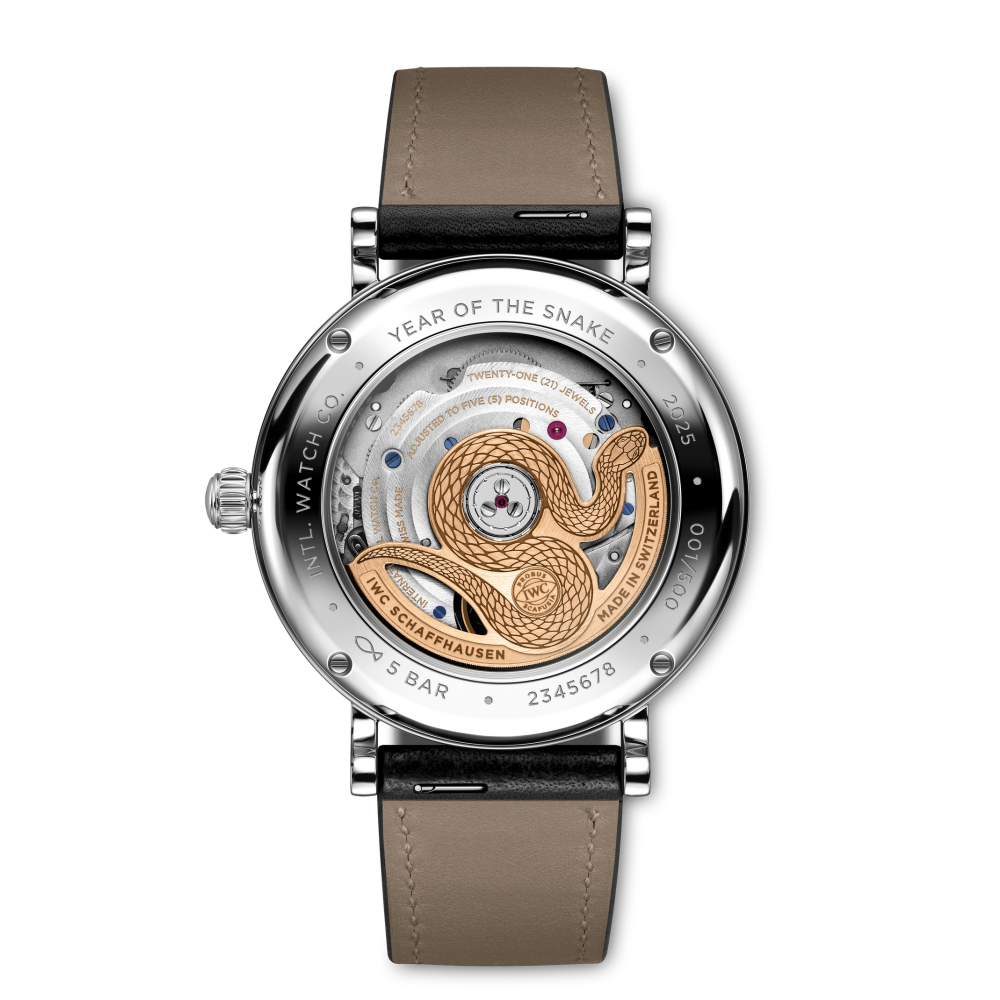Portofino Automatic Moon Phase 37 Year of the Snake, ay yeni yılını anımsatan yılan şeklinde 18 ayar 5N altın salınımlı bir kütleye sahip.