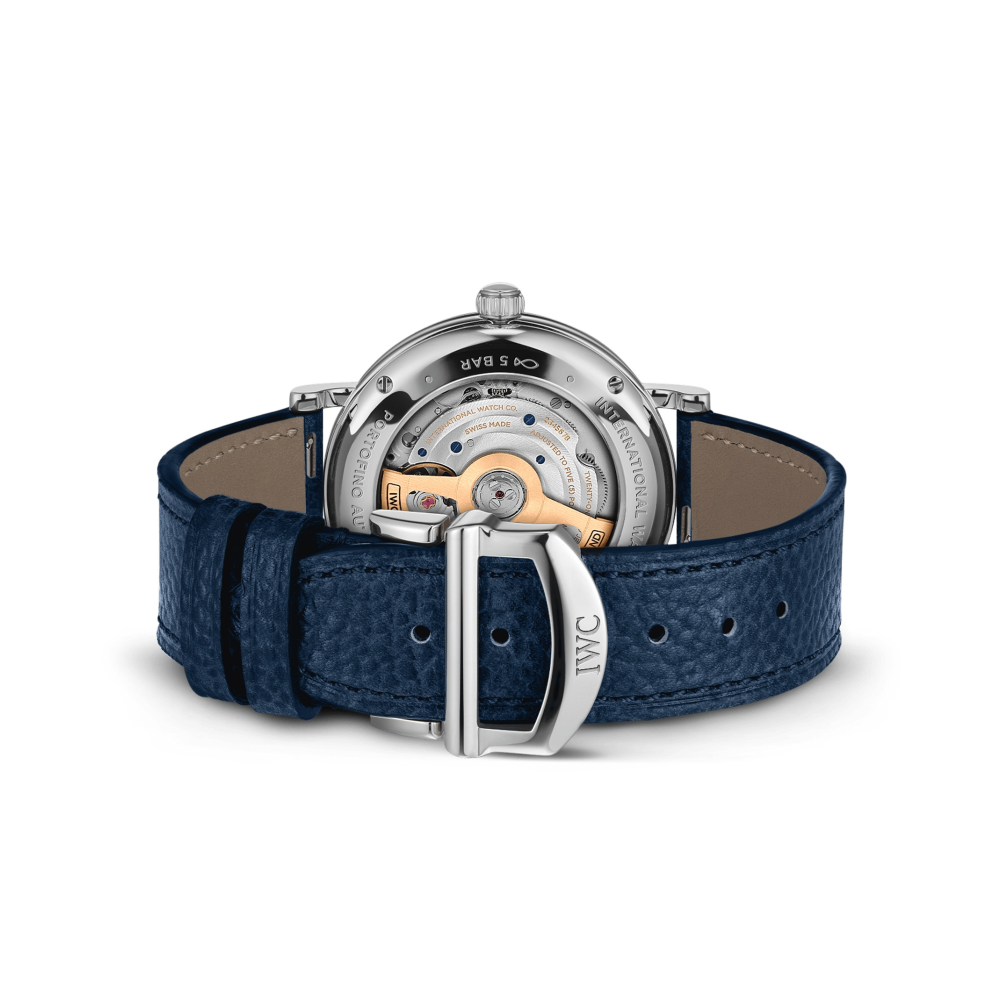Portofino Automatic 37, IWC üretimi 32111 kalibre ve hareketi gösteren şeffaf safir cam arka yüze sahip.