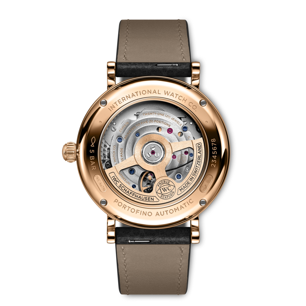 Portofino Automatic 37, IWC üretimi 32111 kalibre ve hareketi gösteren şeffaf safir cam arka yüze sahip.