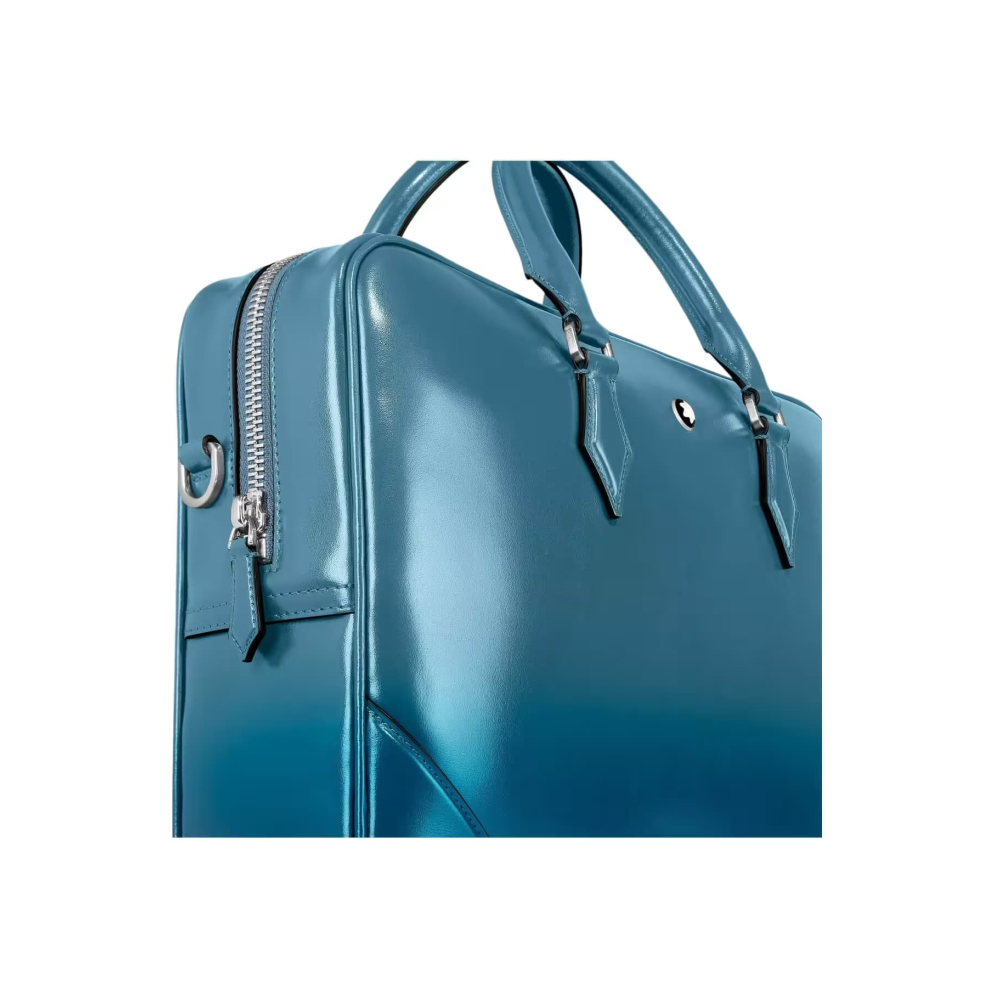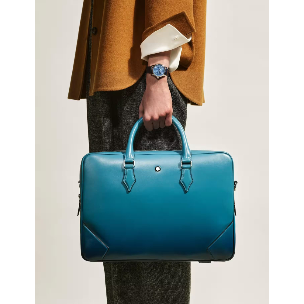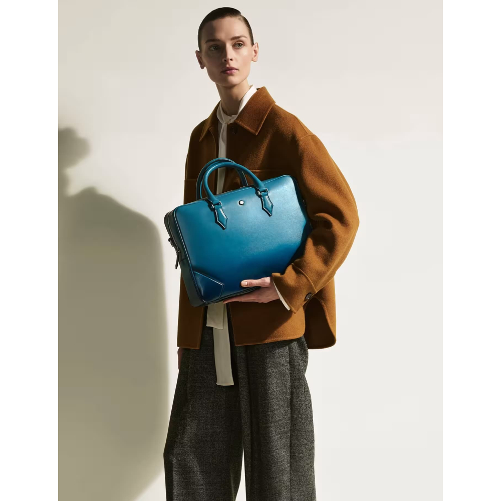 İş seyahatleri için şık bir yol arkadaşı olan bu Meisterstück evrak çantası, Montblanc'ın işçiliğe olan bağlılığının olağanüstü bir örneğidir. Dumanlı mavi derinin lüks hissi, elle uygulanan sfumato efektiyle daha da artırılırken, dikişler, fermuar uçları ve saplar, Montblanc'ın özü olan kalem ucunun şeklini anımsatıyor. Çanta, daha fazla pratiklik için iç cepler sunuyor. Deri üst saplar, çıkarılabilir deri omuz askısı ve uydu sistemi, çoklu taşıma seçenekleri sunuyor.