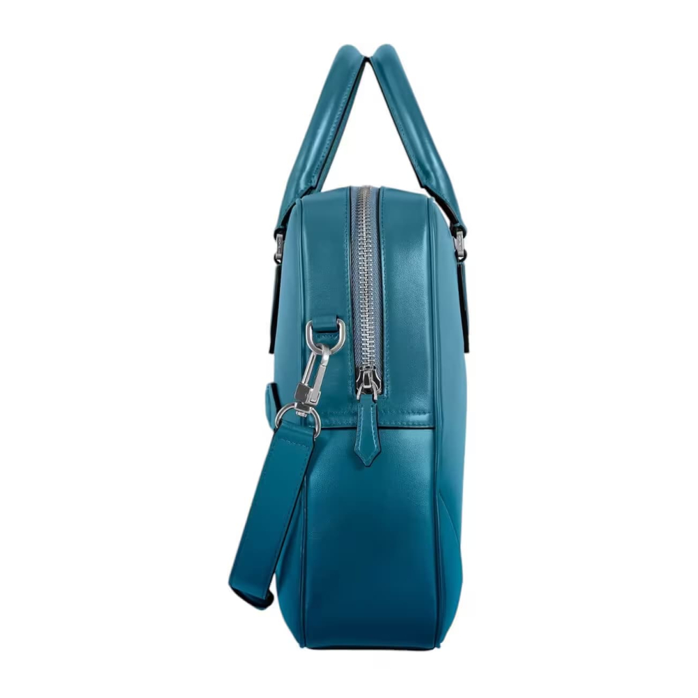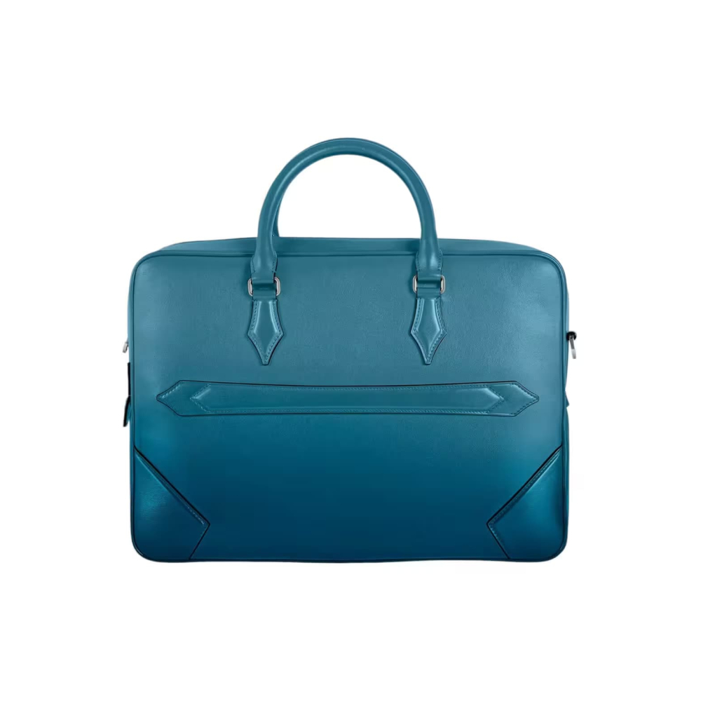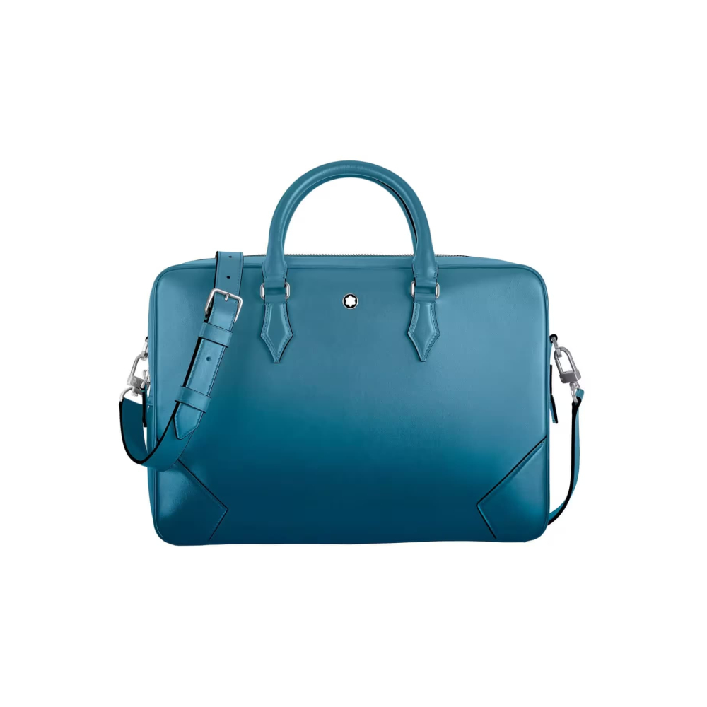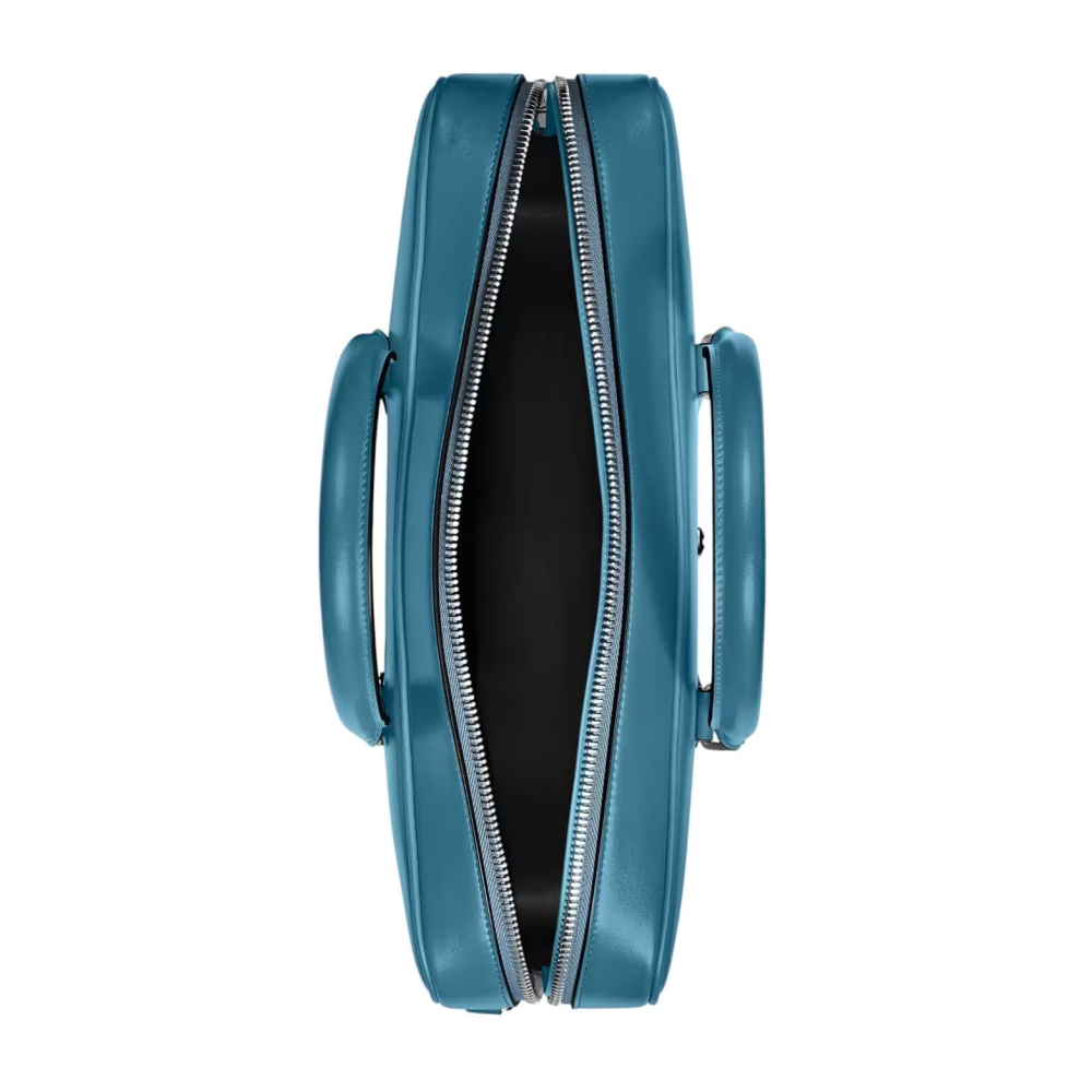 İş seyahatleri için şık bir yol arkadaşı olan bu Meisterstück evrak çantası, Montblanc'ın işçiliğe olan bağlılığının olağanüstü bir örneğidir. Dumanlı mavi derinin lüks hissi, elle uygulanan sfumato efektiyle daha da artırılırken, dikişler, fermuar uçları ve saplar, Montblanc'ın özü olan kalem ucunun şeklini anımsatıyor. Çanta, daha fazla pratiklik için iç cepler sunuyor. Deri üst saplar, çıkarılabilir deri omuz askısı ve uydu sistemi, çoklu taşıma seçenekleri sunuyor.