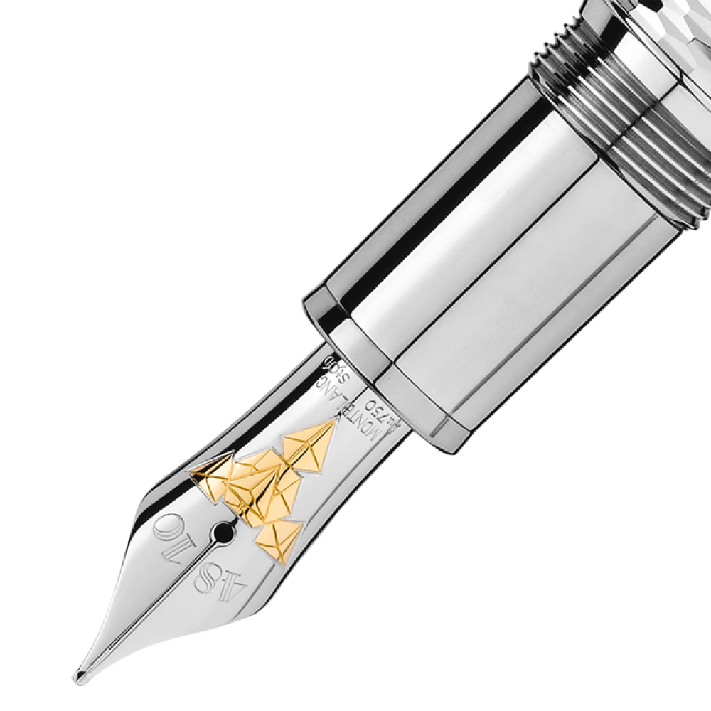 Meisterstück Solitaire Geometric Dimension, Montblanc’ın klasik tasarımını benzersiz malzemelerle birleştirme arzusuyla doğmuştur. Zarif platin tonunda optik etkiye sahip üç boyutlu geometrik desenle işlenmiş bu yazı aracı, özel tasarımlı 18 ayar iki renk kaplamalı uca, platin kaplamalı klipse ve Montblanc marka adıyla kabartmalı üç platin kaplamalı halkaya sahiptir. Montblanc amblemi ile tamamlanan bu kalem, bireyselliğe hitap eder.