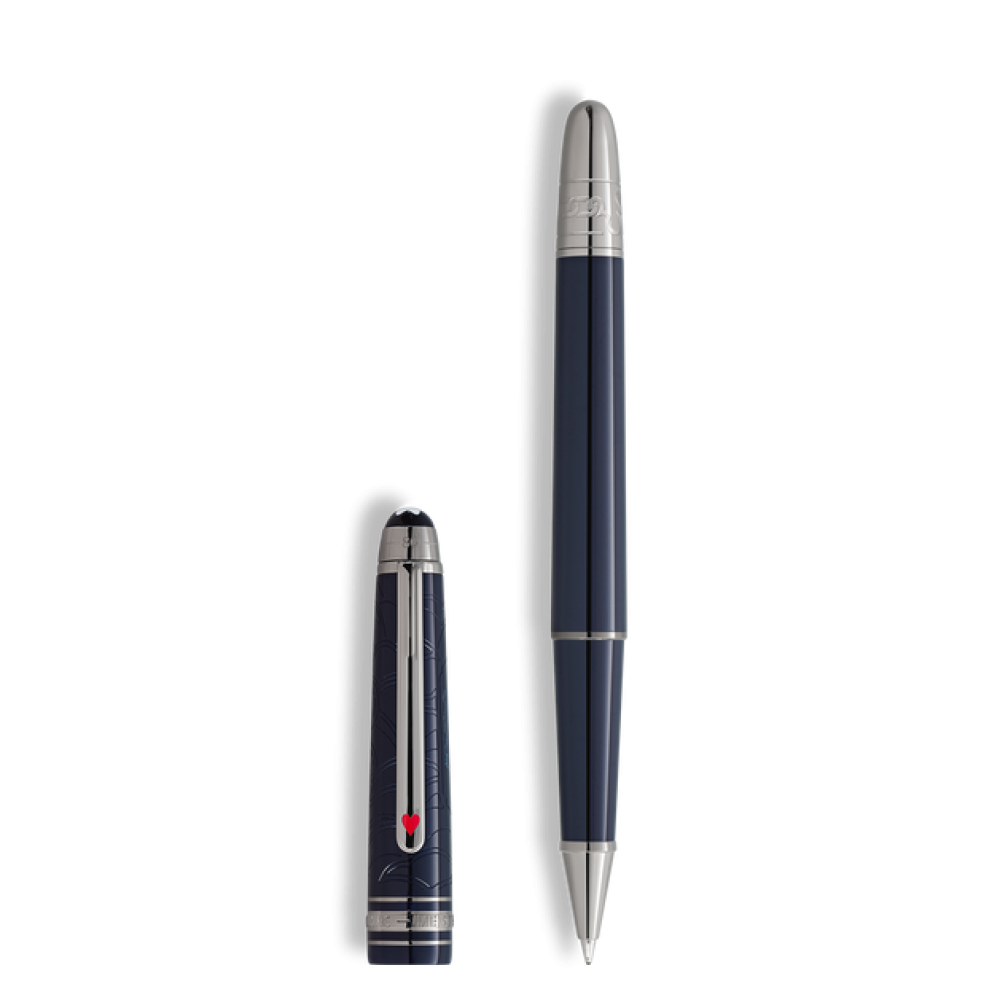 Meisterstück Around the World in 80 Days koleksiyonu, ilhamını Jules Verne’in ünlü macera romanından alır. Koyu mavi değerli reçineyle süslenmiş Classique Tükenmez Kalem, Bay Fogg ve Passepartout’nun epik yolculuğunu anlatır. Çift, Yokohama’dan Londra’ya ABD üzerinden dönerken, geniş Amerikan kıtasını trenle geçer. İnce detaylara dikkat edin – kapağa zarif bir tren lazerle işlenmiş, konik kısmında ise Passepartout’nun Sioux saldırısına uğrayan mürettebatı kurtarmak için lokomotiften treni ayırdığı kritik anı simgeleyen bir güvenlik zinciri deseni yer alır. Kapağın tasarımı basınç valflerini ve lokomotiften yükselen dumanı yakalar, klips ise Phileas Fogg ile Prenses Aouda’nın birlikteliğini simgeleyen kırmızı lake bir kupa kartı sembolü taşır. Ayrıca, kart sembolleri Fogg’un yolculuğu sadece 80 günde tamamlama iddiasını temsil eder. Kapak üstünde yolculuğun kabartmalı zaman çizelgesi yer alır – Yokohama’dan Londra’ya 36 gün ve sonunda dünya turunun toplam 80 günü.