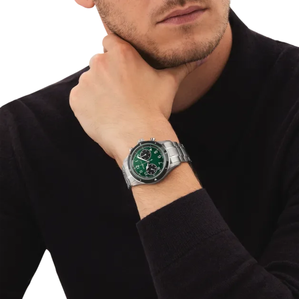 Dağ keşiflerinin ruhunu ve Antarktika'nın buzul manzarasının güzelliğini yakalayan bu Montblanc 1858 Otomatik Kronograf 0 Oxygen modelinin sfumato yeşili buzul desenli kadranı, zümrüt buzdağlarının veya "yeşim buzdağlarının" koyu yeşil renginden ilham almıştır. Saat, tamamen oksijensiz 42 mm paslanmaz çelik kasaya sahiptir. Kadran, saat 9 konumunda siyah küçük saniye göstergesi ve saat 3 konumunda siyah 30 dakikalık kronograf sayacı bulunan bi-compax kronograf konfigürasyonuyla süslenmiştir. Alt kadranlarla uyumlu olan bu saat, ışıldayan ana noktalara sahip siyah çift yönlü seramik bir bezel ile birlikte gelir. Konik ve ince ayar sistemli değiştirilebilir paslanmaz çelik bilezik ve "Keşif Ruhu" özel gravürlü kazınmış kasa arkası ile donatılmıştır.