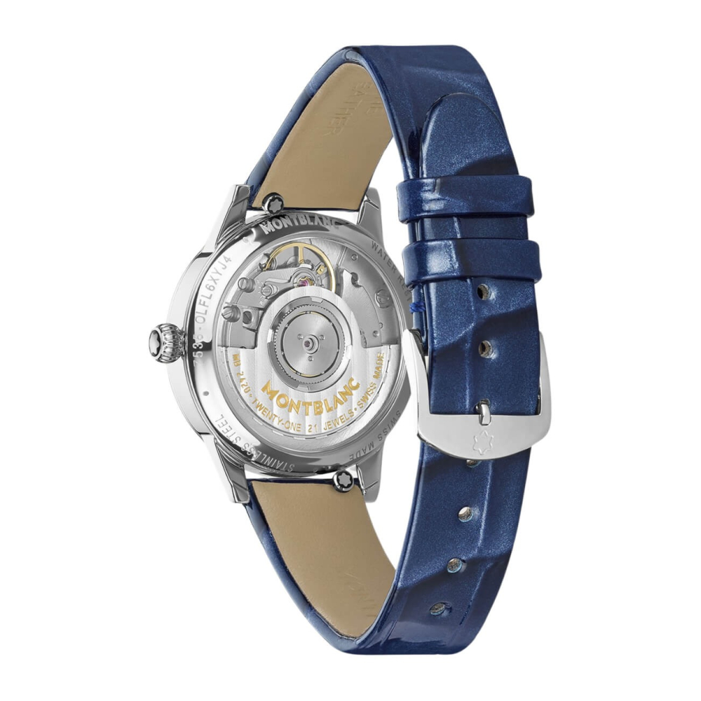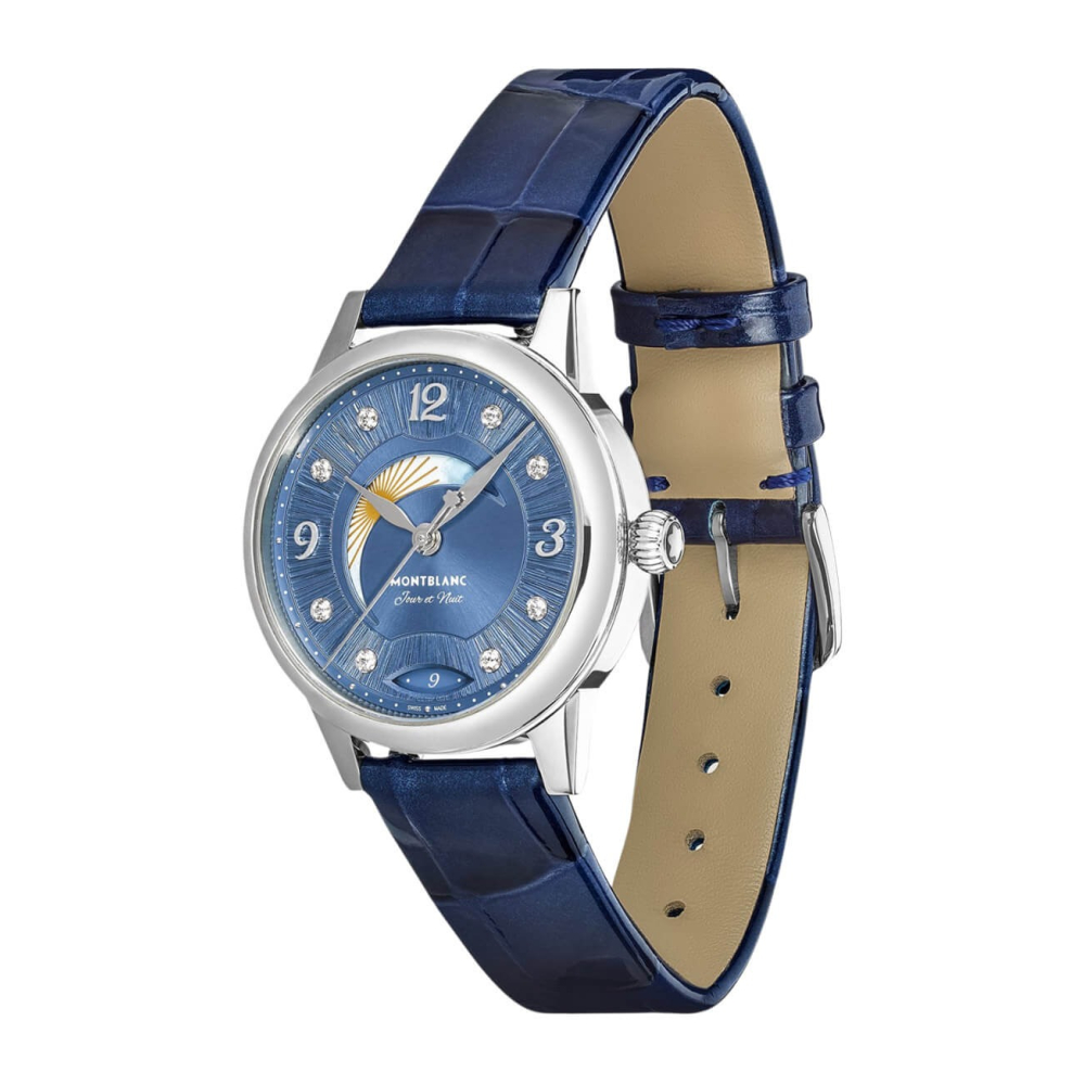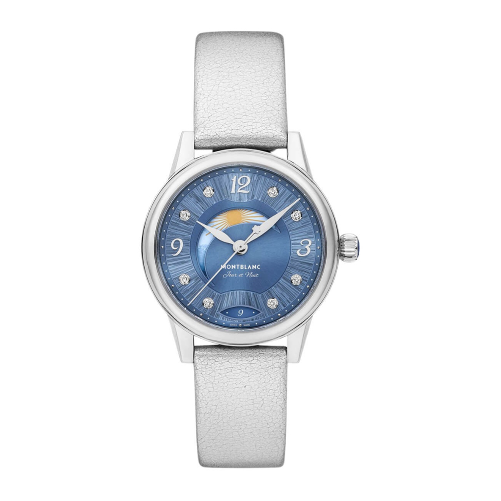 Zarif ve kadınsı bir şekilde incelikli saatçiliğin kodlarını yorumlayan Montblanc Bohème Day & Night, el yazısı ve suluboya dünyasından ilham alıyor ve 34 mm paslanmaz çelik kasayla geliyor. Elmas indeksler, rodyum kaplamalı çiçek desenli Arap rakamları ve kollarla süslenmiş zarif, güneş fırçalanmış mavi bir kadrana sahip. Diğer zarif detaylar arasında filet sauté deseni ve filé d'étoiles adı verilen bir damgalama tekniği yer alıyor. Otomatik kalibre MB 24.20 ile donatılan bu model, saat, dakika ve saniyelerin yanı sıra badem şeklindeki bir açıklıkta el yazısı rakamlarla gösterilen tarihi de gösteriyor. Kadranda, gündüz ve gece ifadesi için romantik bir yazı tipi de kullanılmış: "Jour et Nuit". Gökyüzü temalı gündüz ve gece komplikasyonu, 24 saatlik bir süre boyunca değişen gökyüzünü gösteriyor ve suluboyayla yaratıldığı için saate romantik ve sanatsal bir dokunuş katıyor. Bu saat, timsah desenli değiştirilebilir mavi dana derisi kayış ve ek bir kayışla donatılmış.