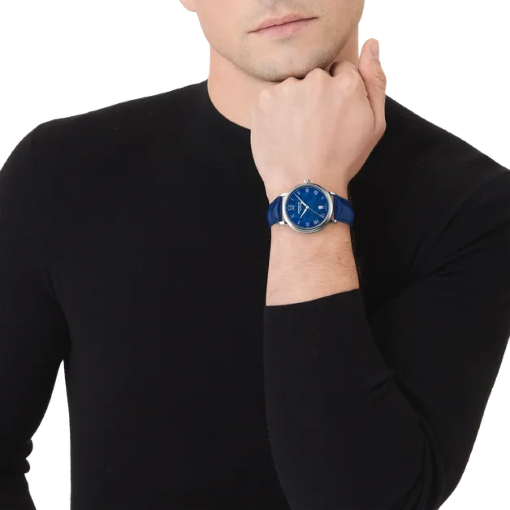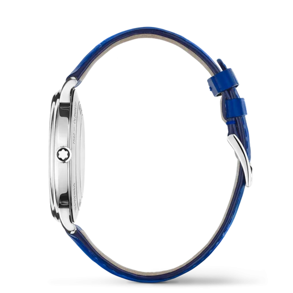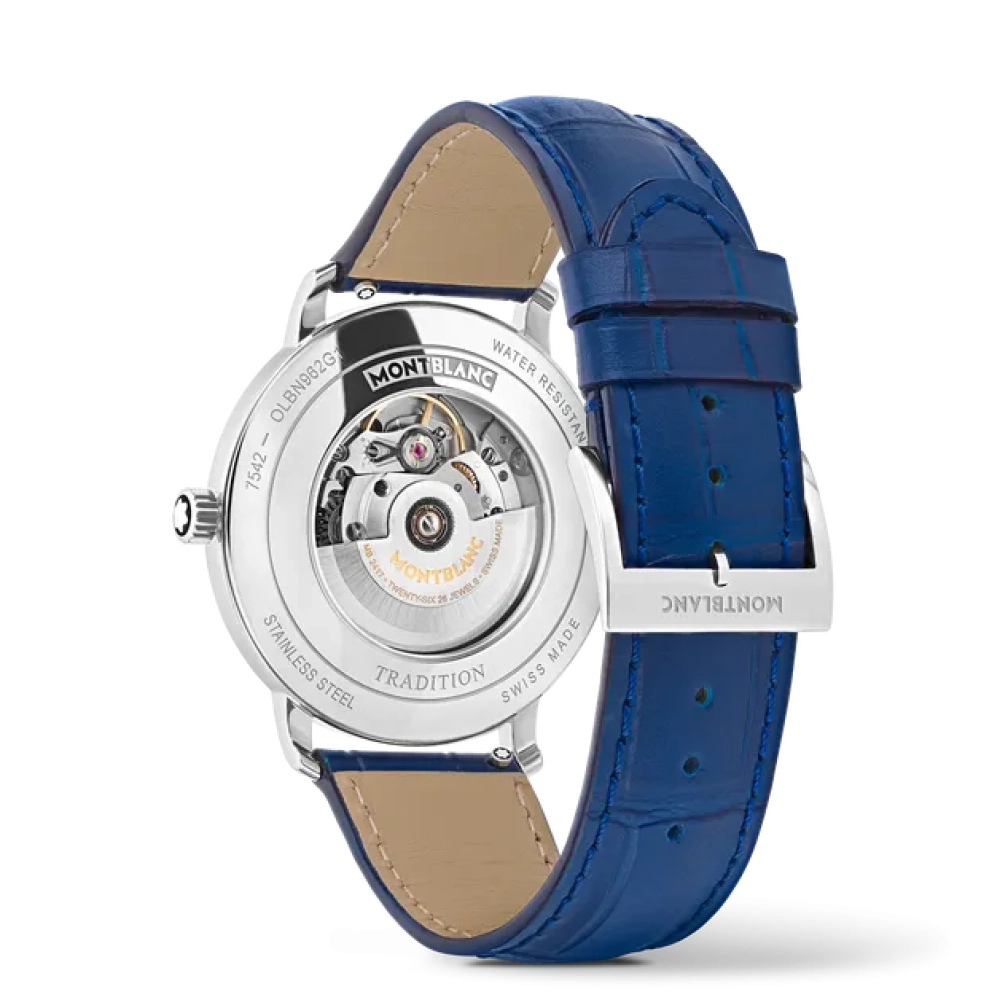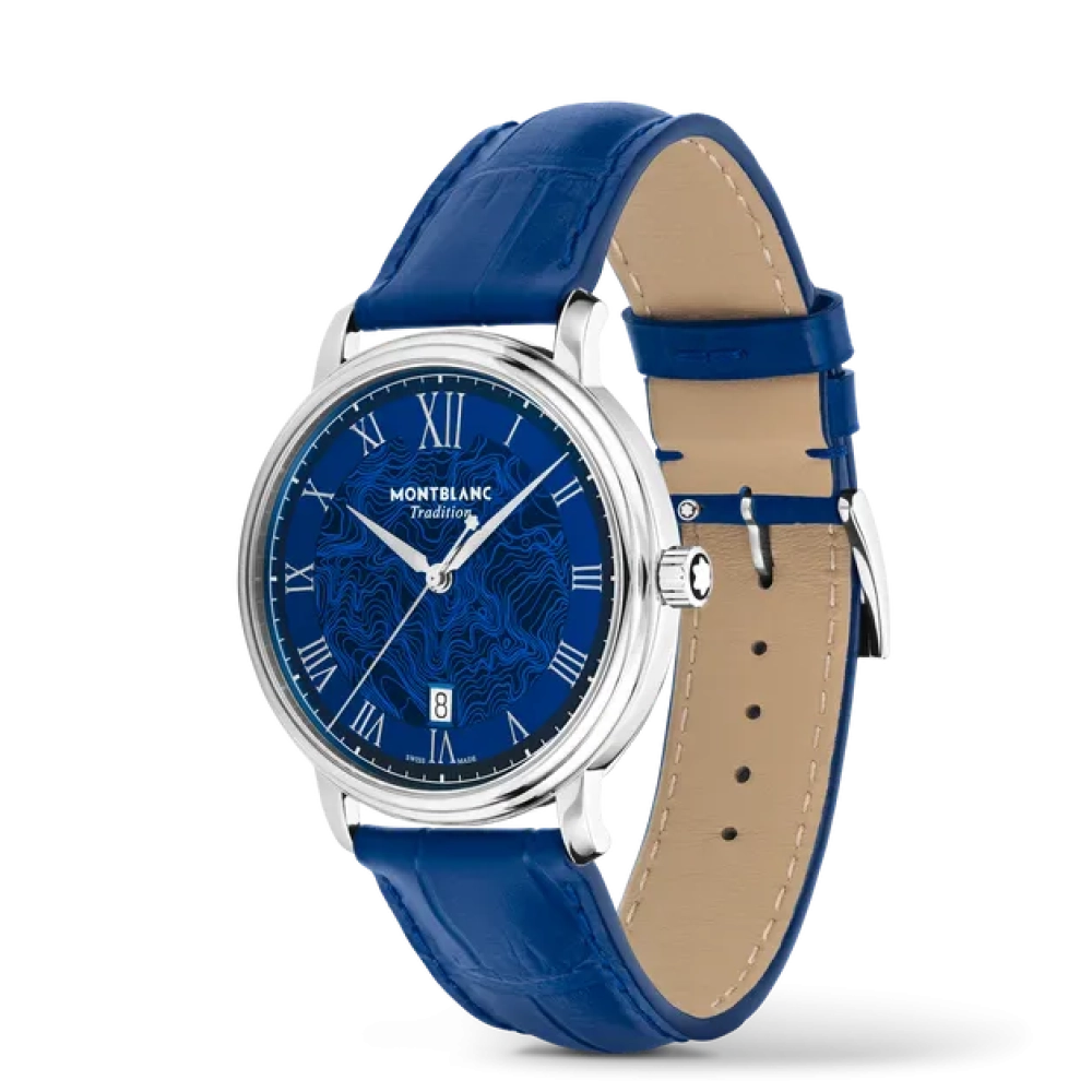 Montblanc Tradition Automatic Date, düz boynuzlu ve çift taraflı çerçeveli 40 mm paslanmaz çelik kasayla geliyor. Saat, Mont Blanc'ın topografyasını gümüş renkli Romen rakamları ve belirgin "XII" Roma rakamıyla tasvir eden mavi bir kadrana sahip. Kılıç şeklindeki saat ve dakika kolları, saniye kolu ve Montblanc amblemli kurma kolu ve mavi değiştirilebilir dana derisi kayış, modern ve zarif görünümünü tamamlıyor.
