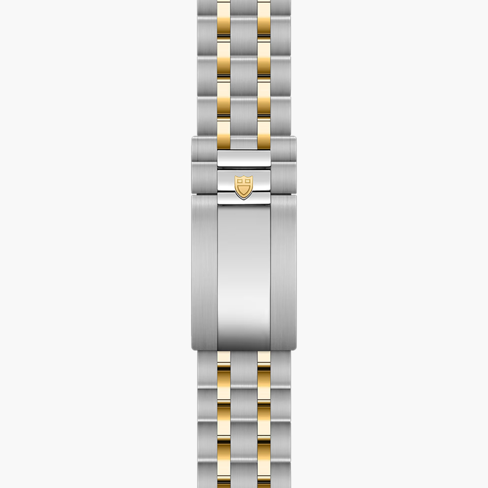 Bu TUDOR Royal, kasayla kesintisiz bir çizgi oluşturan entegre metal bileziğiyle akıcılık ve kusursuz tarzın vücut bulmuş hâlidir. Cilalı iki ince bağlantı arasına yerleştirilmiş üç adet geniş ve saten fırçalanmış bağlantısıyla öne çıkan bilezik, yüzeyinin ve kenarlarının kaliteli pürüzsüzlüğüyle ve de “T-fit” tokasıyla TUDOR’un bilekteki rahatlığa verdiği önemi vurgular. Paslanmaz çelik veya birbirini takip eden paslanmaz çelik ve sarı altın bağlantılarıyla bu serideki modellerin finisajları her zevke uygundur.